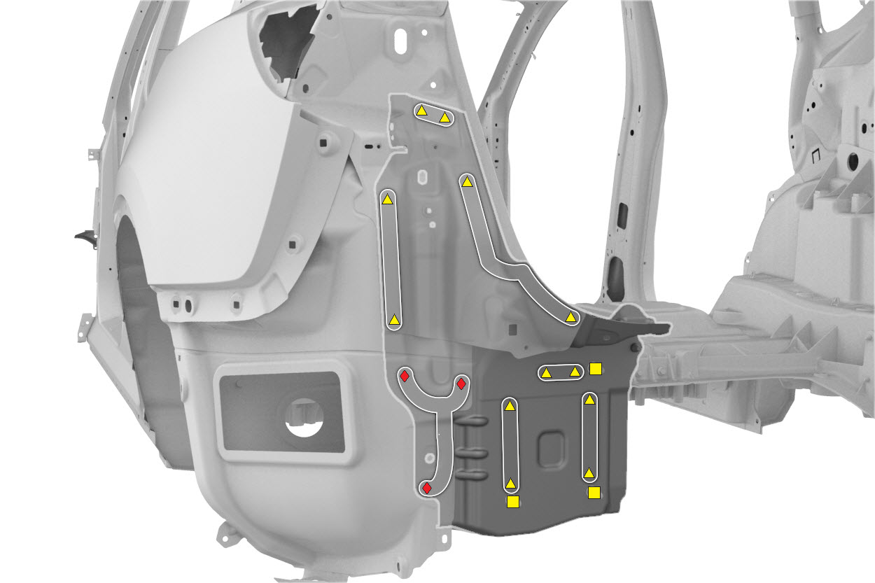 o bulloni, testa esagonaleNotaI bulloni non vengono installati in questa fase. Questi bulloni vengono installati dall'interno del veicolo attraverso la piastra terminale guida posteriore, laddove sono stati rimossi i prigionieri. - Applicare adesivo strutturale sulle superfici di accoppiamento del veicolo e del/i nuovo/i componente/i.
