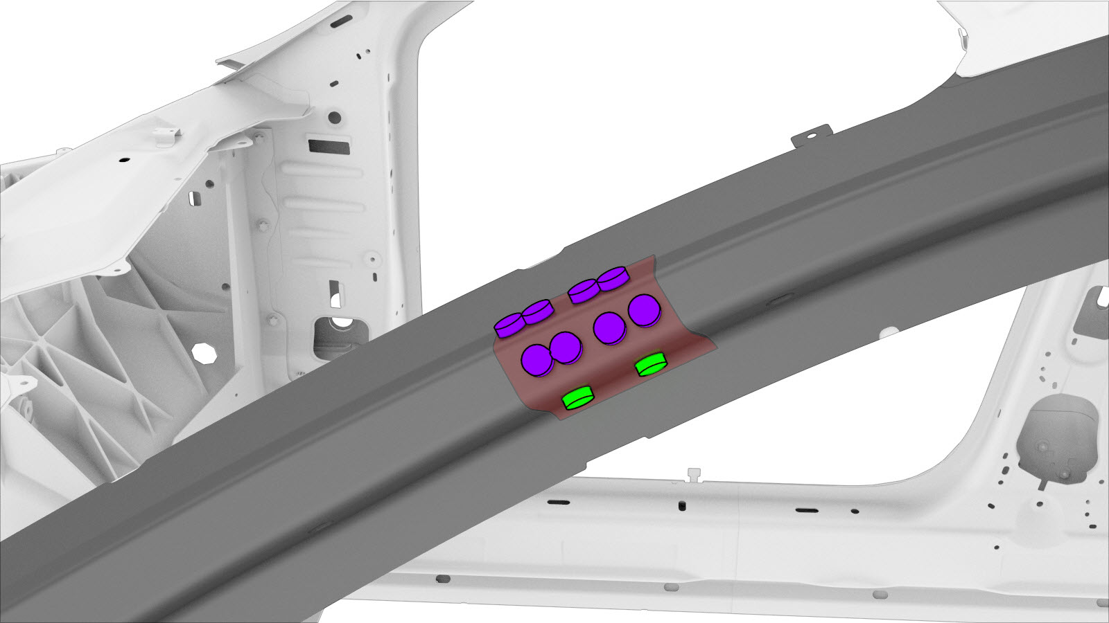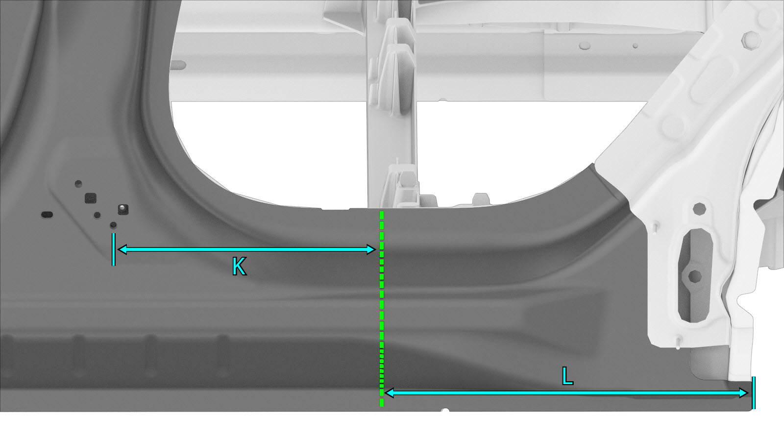 Linea di taglio tra parte superiore montante B e parte inferiore montante B Linea di taglio tra parte inferiore montante B e parte posteriore della soglia Piastra di supporto tra parte superiore montante B e parte inferiore montante B Piastra di rinforzo tra parte inferiore montante B e parte posteriore della soglia |