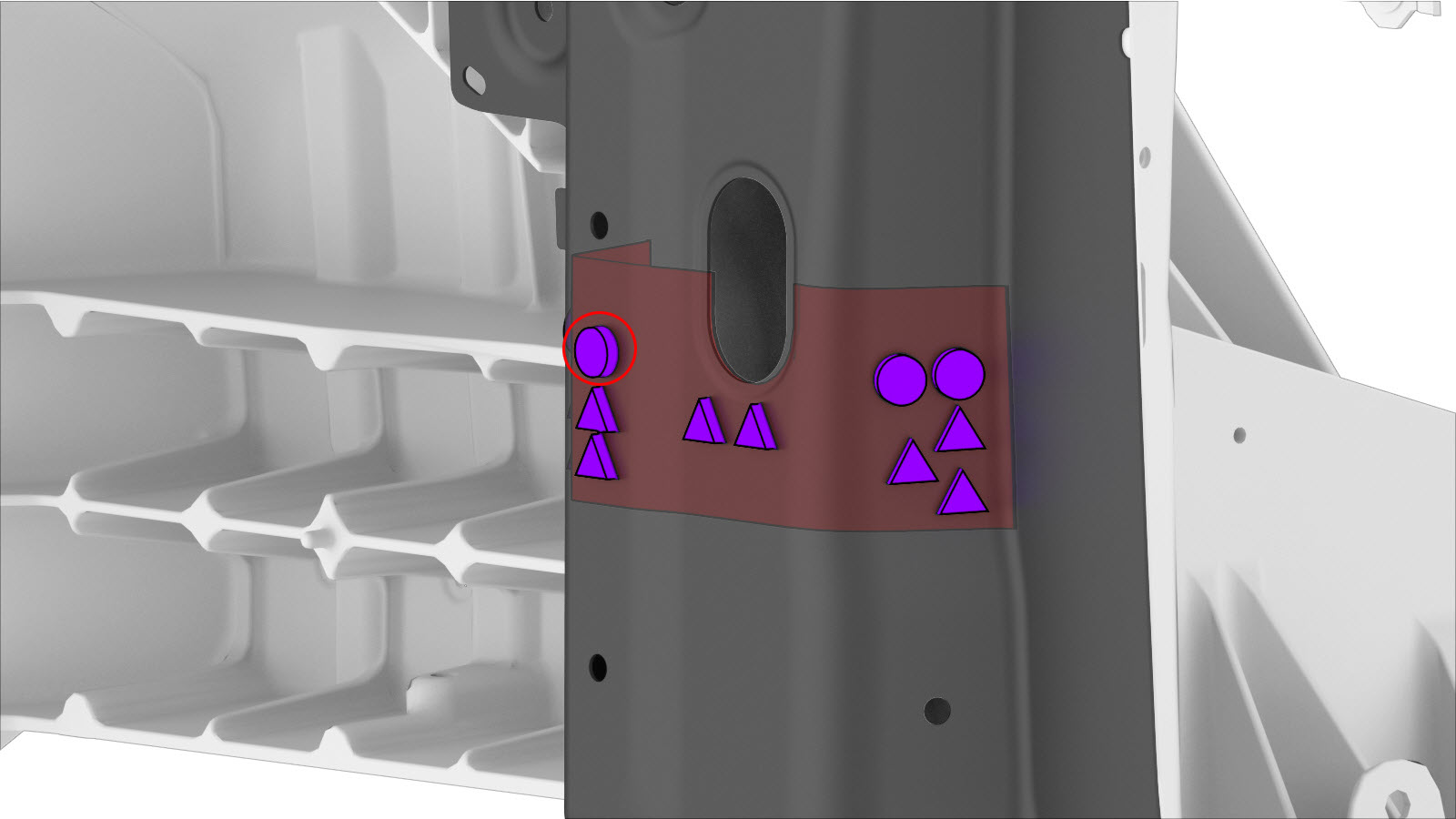 Solo riparazione della sezione del montante cerniere: Installare il dispositivo di fissaggio cerchiato in rosso nella posizione indicata.
