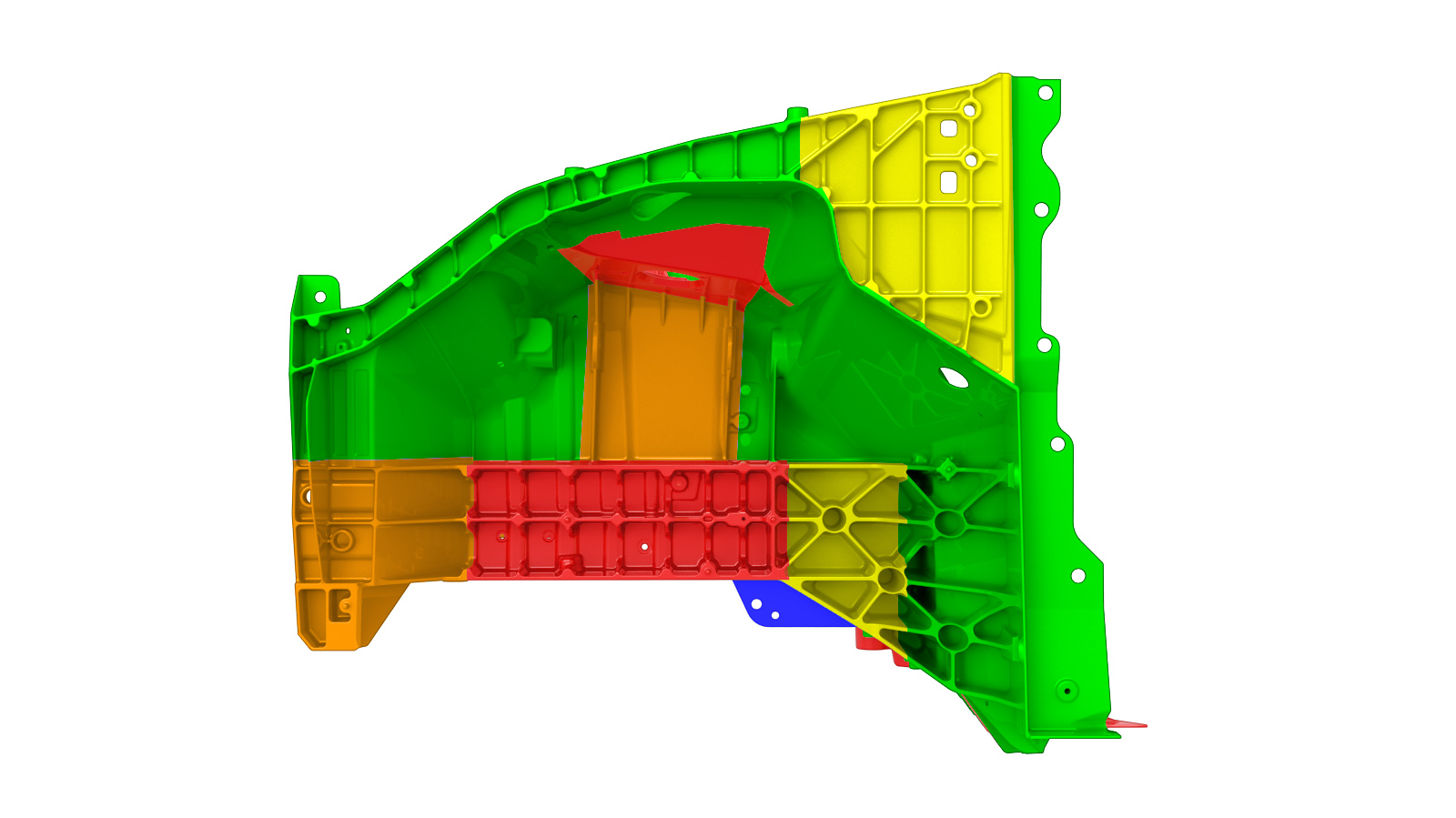 Le immagini seguenti mostrano il sottoscocca anteriore pressofuso da diverse angolazioni e contengono alcune aree evidenziate. Confrontare l'area danneggiata del sottoscocca anteriore del veicolo con le immagini sottostanti, quindi utilizzare i criteri di riparazione corrispondenti al colore dell'area evidenziata per individuare quelli da seguire per determinare se l'area danneggiata del componente può essere riparata.