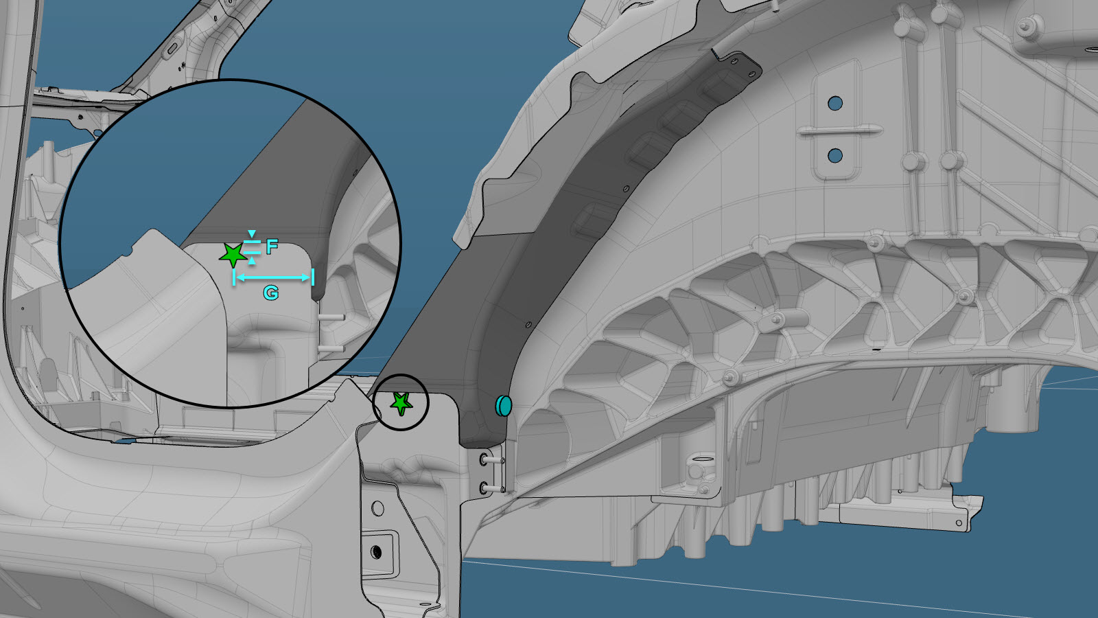 警告轮罩的剩余部分必须在内侧区域与维修零件重叠至少 25 毫米。或 流型铆钉,S38- F = 10 毫米