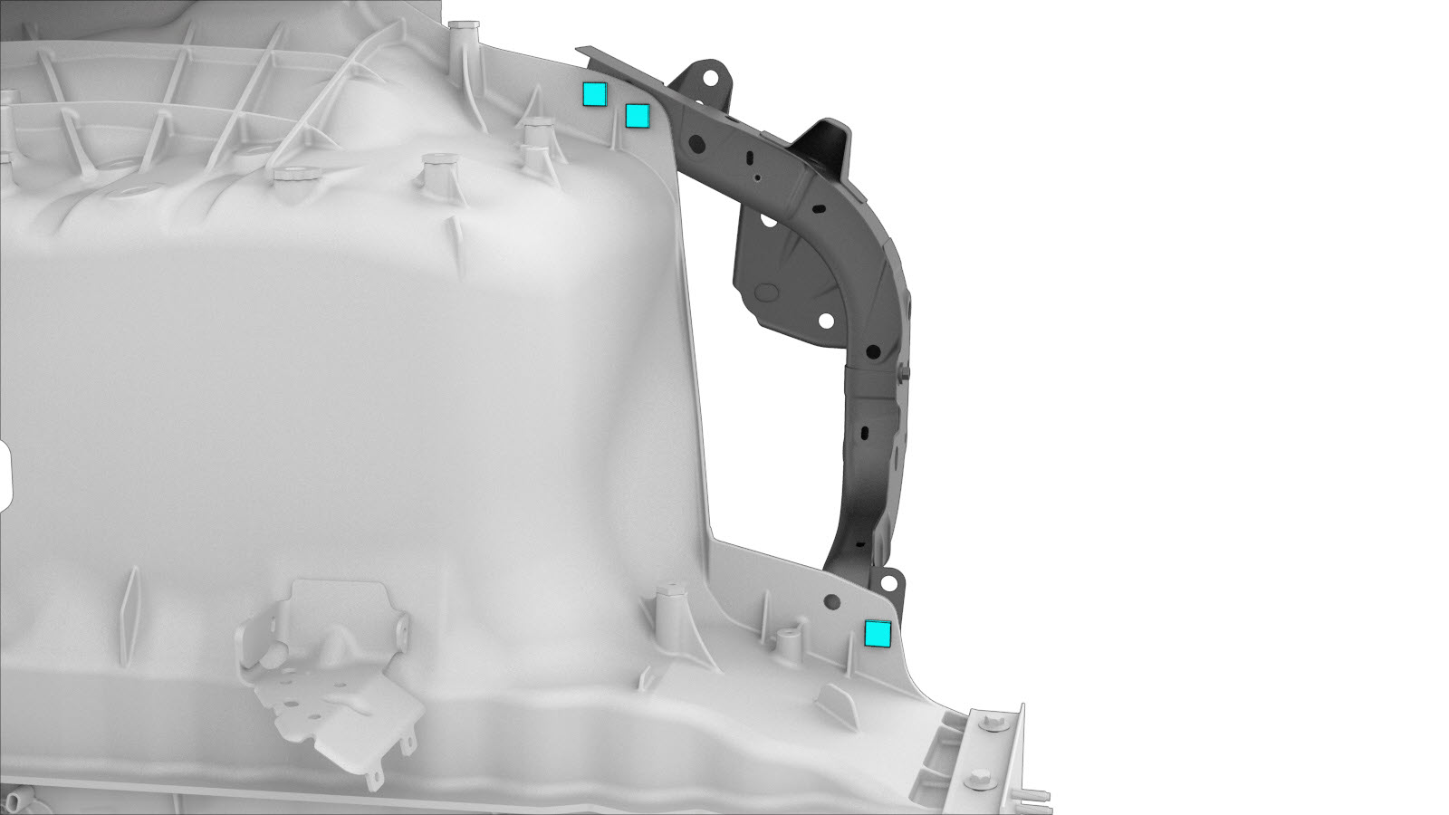 Serrez les boulons à un couple de 28 Nm.RemarqueLors de l'installation du support avant en plastique, les broches d'alignement en plastique peuvent être coupées si nécessaire.