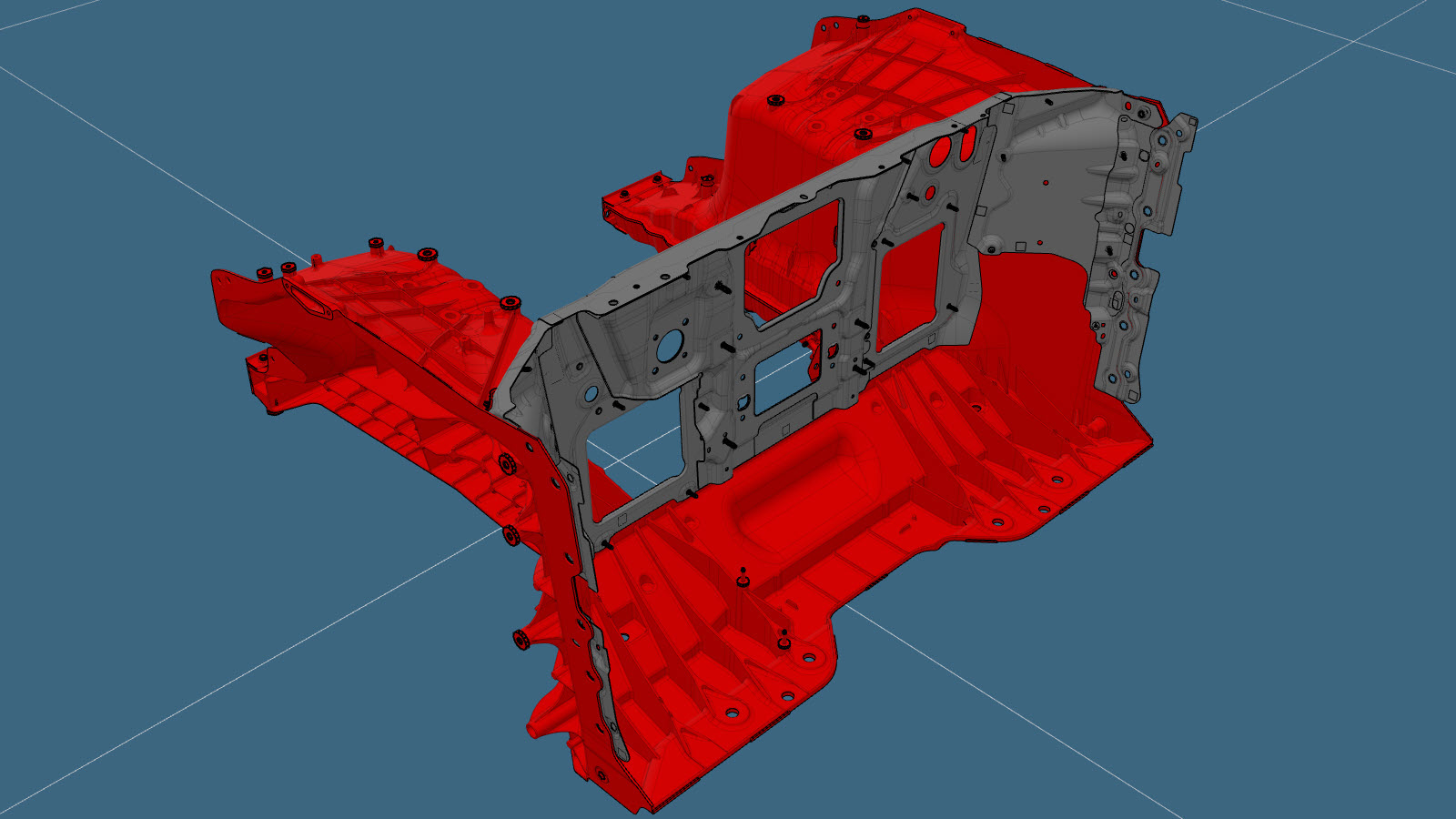 Comme ensemble unique, retirez l'ensemble de renforcement du tableau de bord et le renfort de pont de carrosserie avant de la pièce de service complète du soubassement de la carrosserie avant pour fabriquer le nouveau composant.