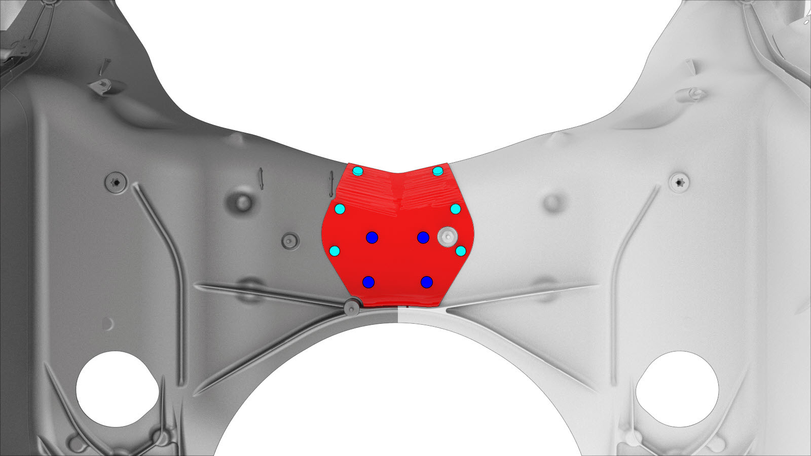 Coupez la partie restante du composant existant sur le véhicule pour l'adapter.RemarqueL'écart maximum entre les composants nouveaux et existants est de 3 mm.RemarqueUn X rouge indique un emplacement où une fixation installée en usine n’est pas remplacée.