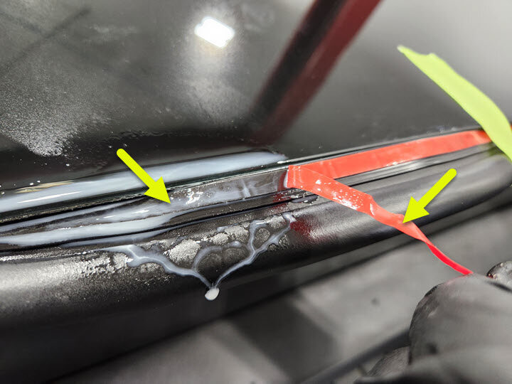 NotaUse 3M adhesive promoter.NotaPull red backing then spray adhesive promoter onto seal double-sided tape, Fully press seal in between glass and body, Remove tape as needed, Align seal with glass edge