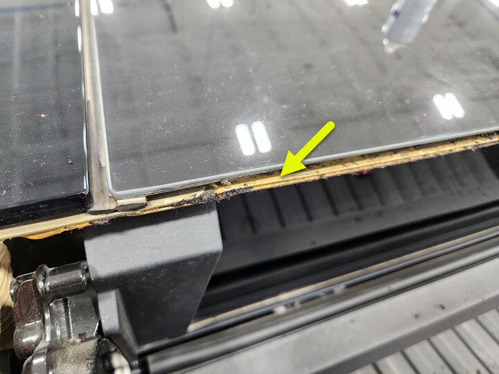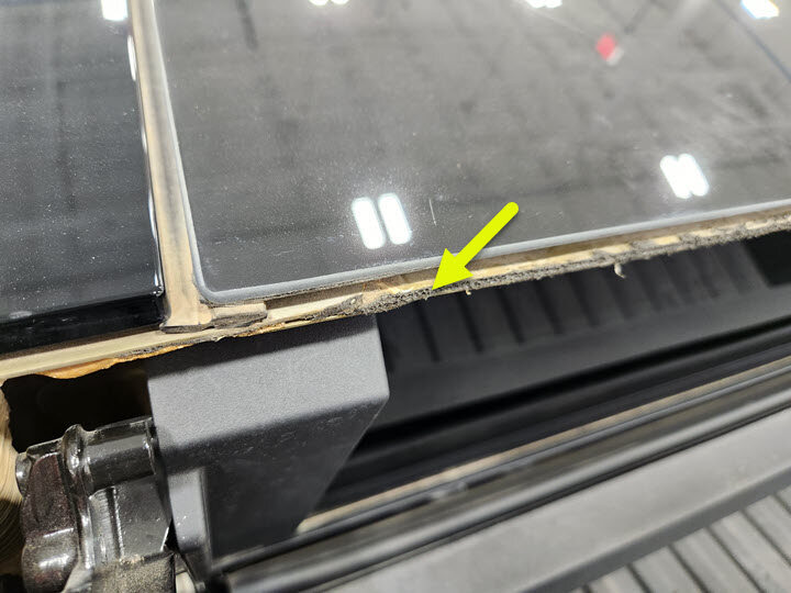 Retire los restos de adhesivo de la carrocería en el borde trasero del cristal del techo.