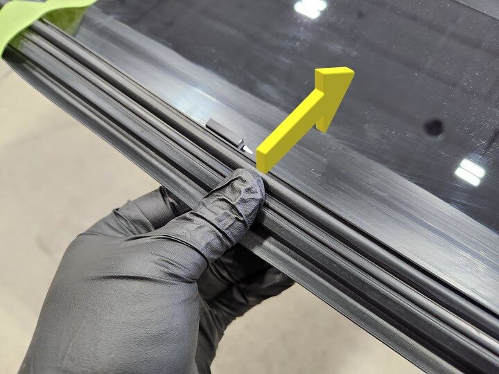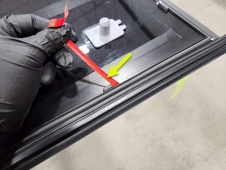 Al retirar la cinta posterior roja, coloque la cinta en el borde trasero del cristal del techo y fíjela en su sitio con cinta protectora.