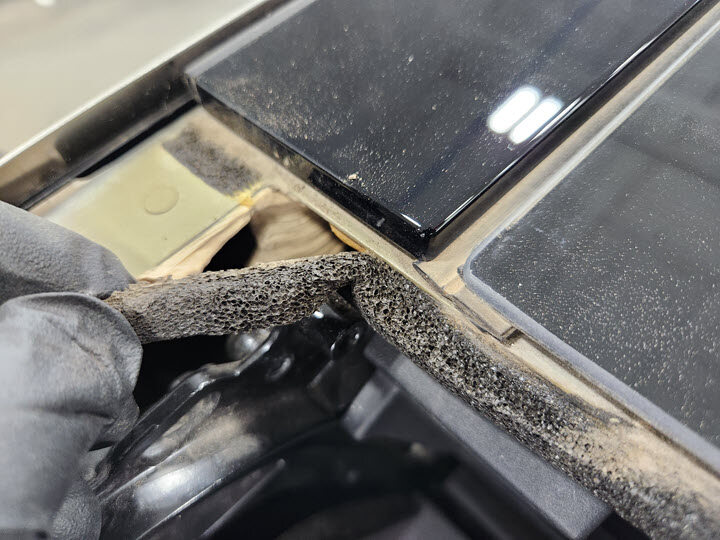 Retire la espuma de la carrocería del borde trasero del cristal del techo.