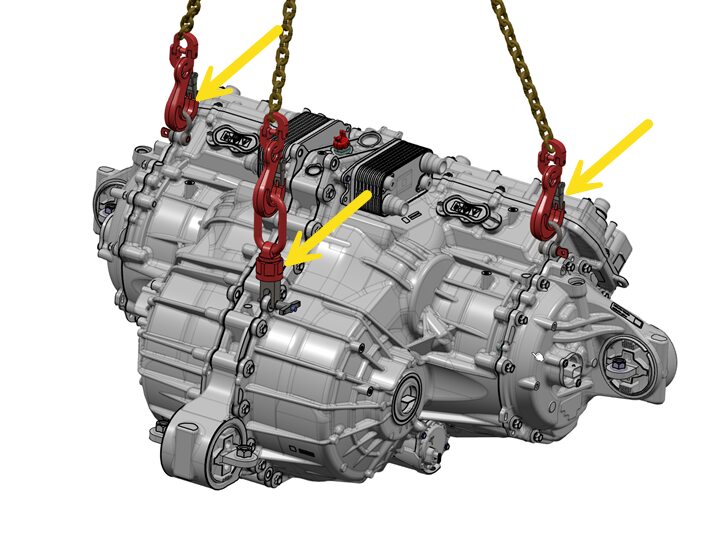 Eleve por completo la unidad de tracción trasera y el bastidor auxiliar hasta su posición.