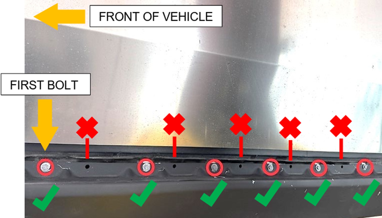 RemarqueInstall the first bolt on the second fastener hole closest to the front of the vehicle, and then install the remaining bolts while maintaining one exposed fastener hole between every bolt.RemarqueDo not torque the bolts at this time.