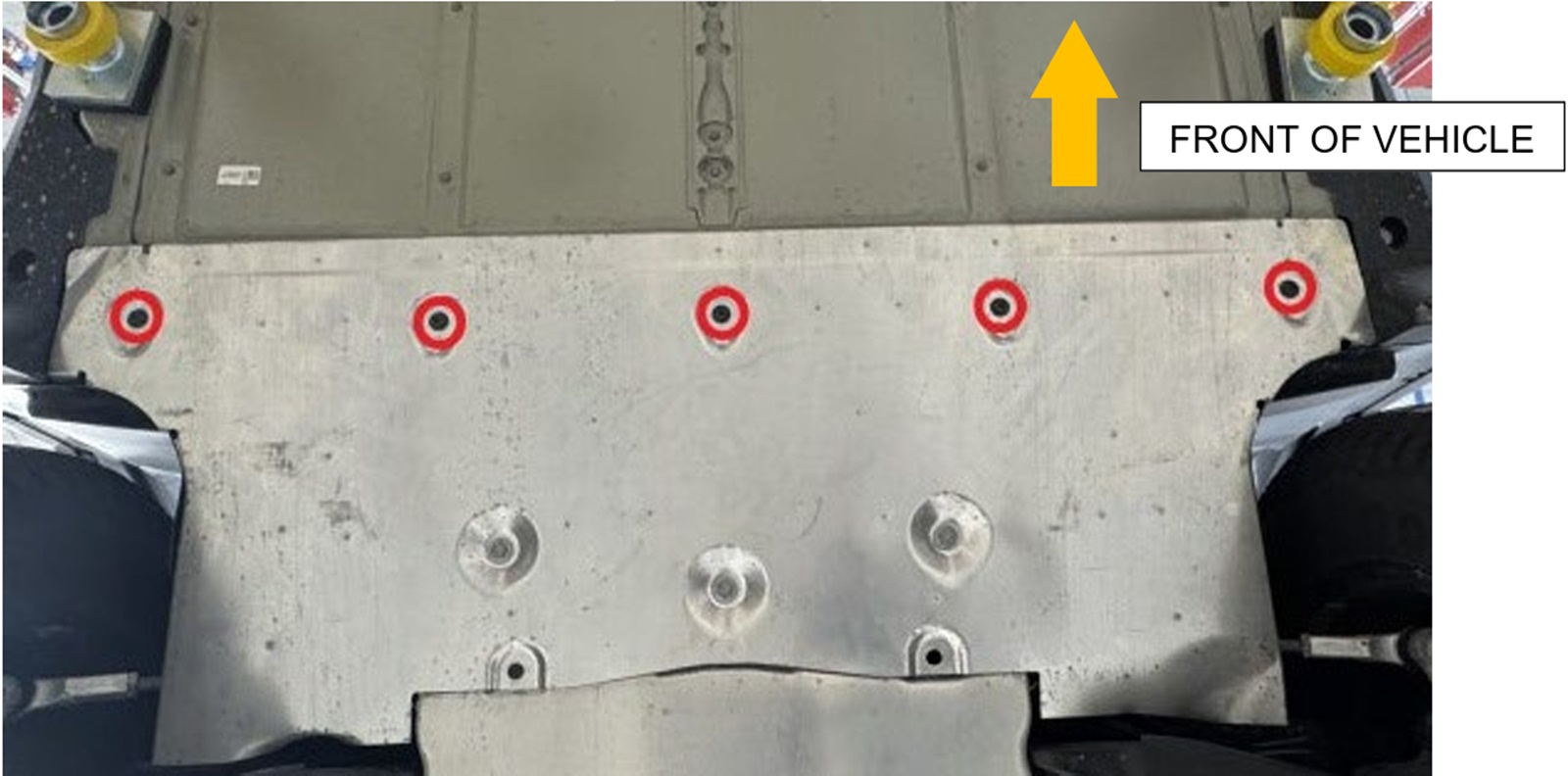 - Remove and discard the bolts (x5) that attach the front edge of the HV battery rear skid plate to the vehicle. See Skid Plate - Rear (Remove and Install).