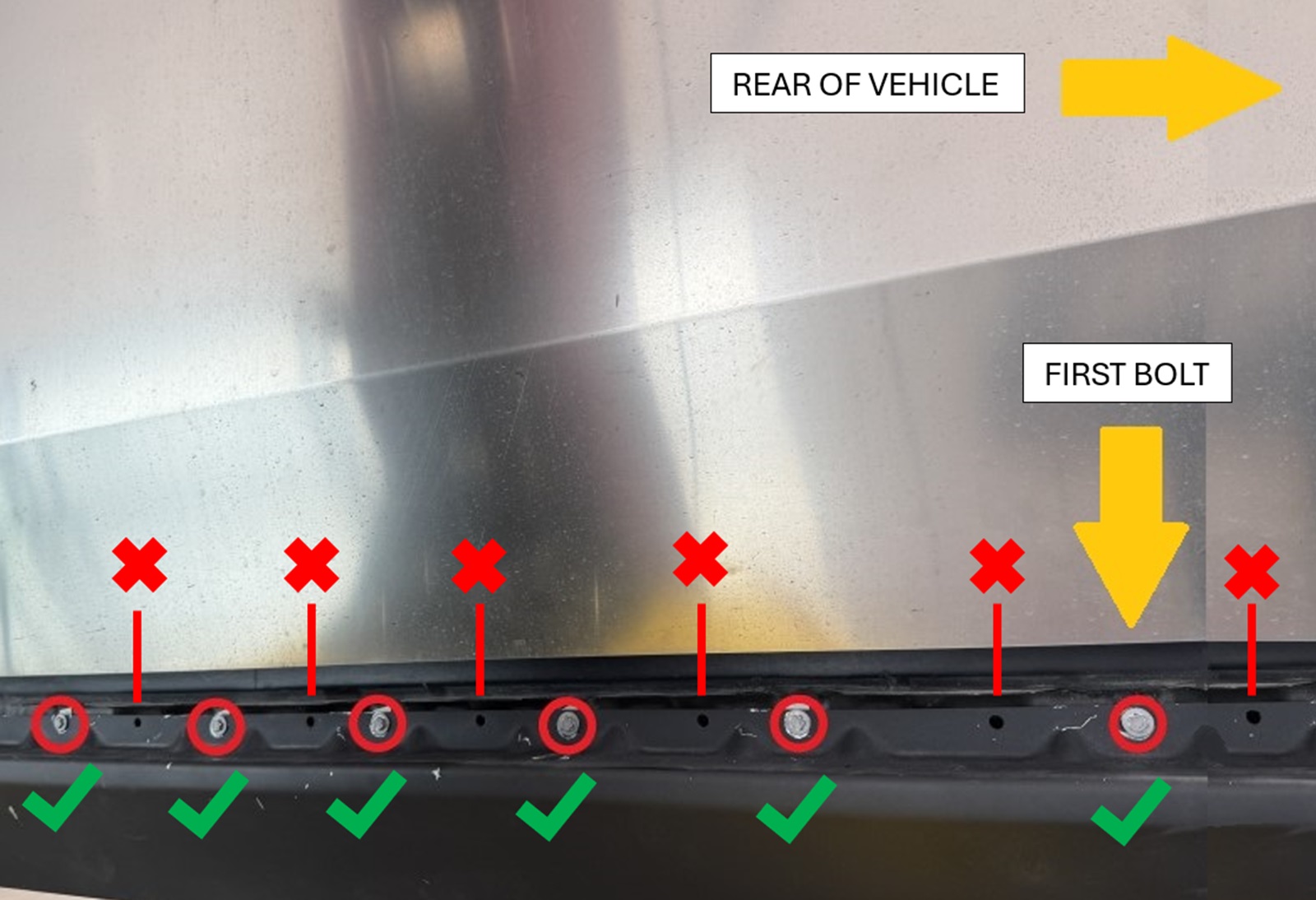 RemarqueInstall the first bolt on the second fastener hole closest to the rear of the vehicle, and then install the remaining bolts while maintaining one exposed fastener hole between every bolt.RemarqueDo not torque the bolts at this time.