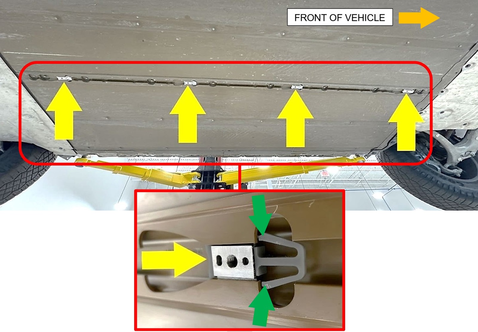 Position the off road center ski nuts (x4) on the vehicle, and then slide the center ski nuts inside of the HV battery ski rail towards the front of the vehicle until the tabs engage with the ski rail.
