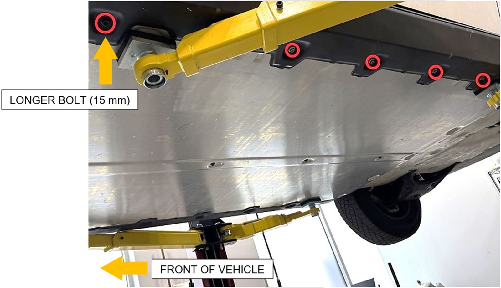 ATTENTIONDo not install the bolts (x5) that attach the front edge of the HV battery rear skid plate to the vehicle at this time. Skip to step 18.
