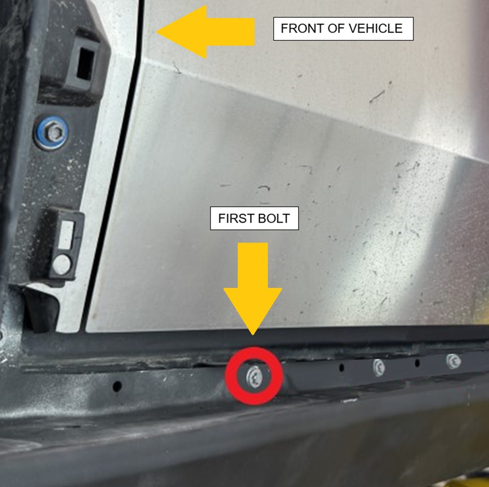 Torque the bolts (x5) that attach the LH off road structural rocker to the vehicle under body.28 Nm (20.6 lbs-ft)ATTENTIONThe forwardmost bolt is longer with a 15 mm drive size.RemarqueMake sure the bolts that attach the structural rocker to the vehicle under body are torqued first before proceeding to the next step.TIpNous recommandons l’utilisation des outils suivants :