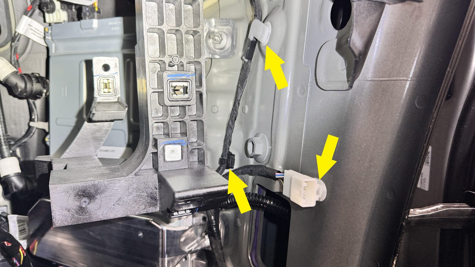 Continuez d'appliquer une légère tension aux fils du faisceau et utilisez le pic pour appuyer sur la languette intérieure dans la moitié inférieure du connecteur du faisceau, puis débranchez le faisceau du connecteur du montant A.