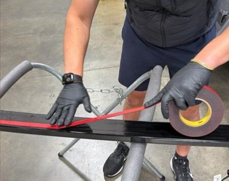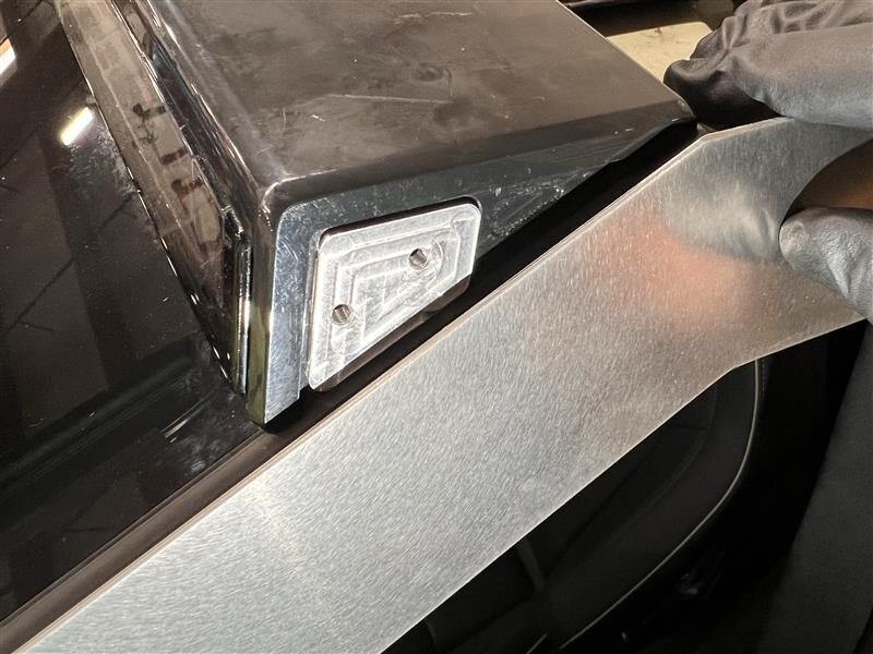 With assistance, align the upper portion of the lightbar with the upper exterior portion of the windshield, position the lightbar evenly on the windshield, and then press down on the lightbar to fully adhere the double-sided tape onto the windshield.