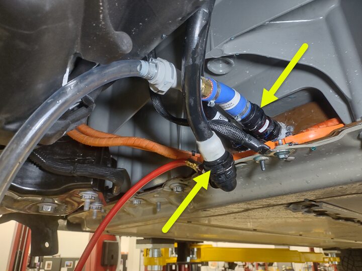 RemarquePosition coolant drain container under front high voltage battery coolant connections