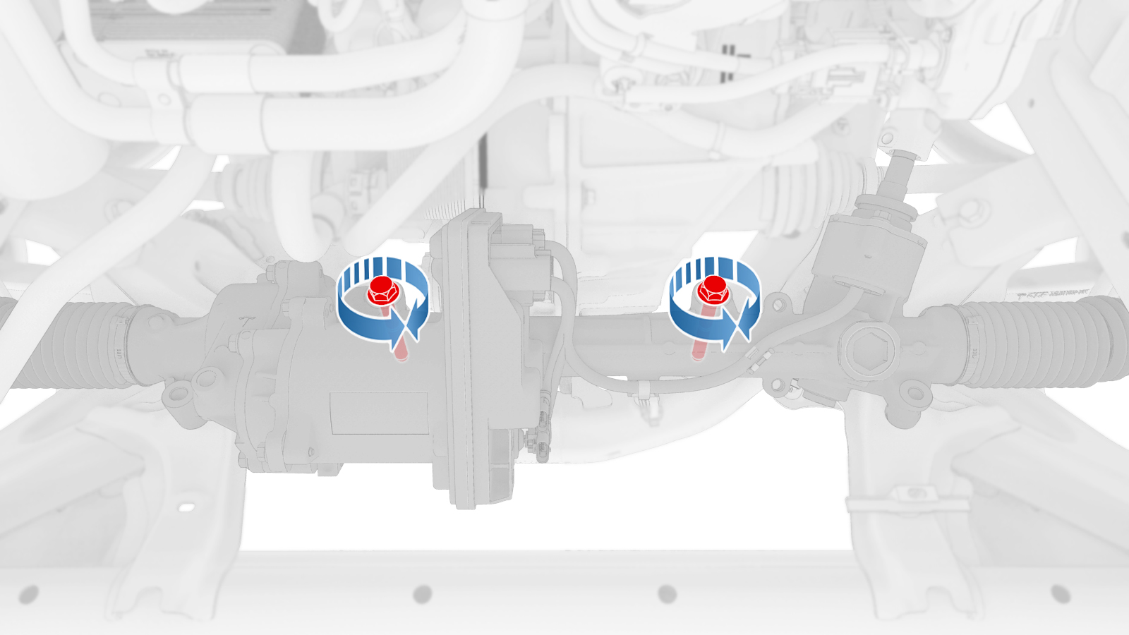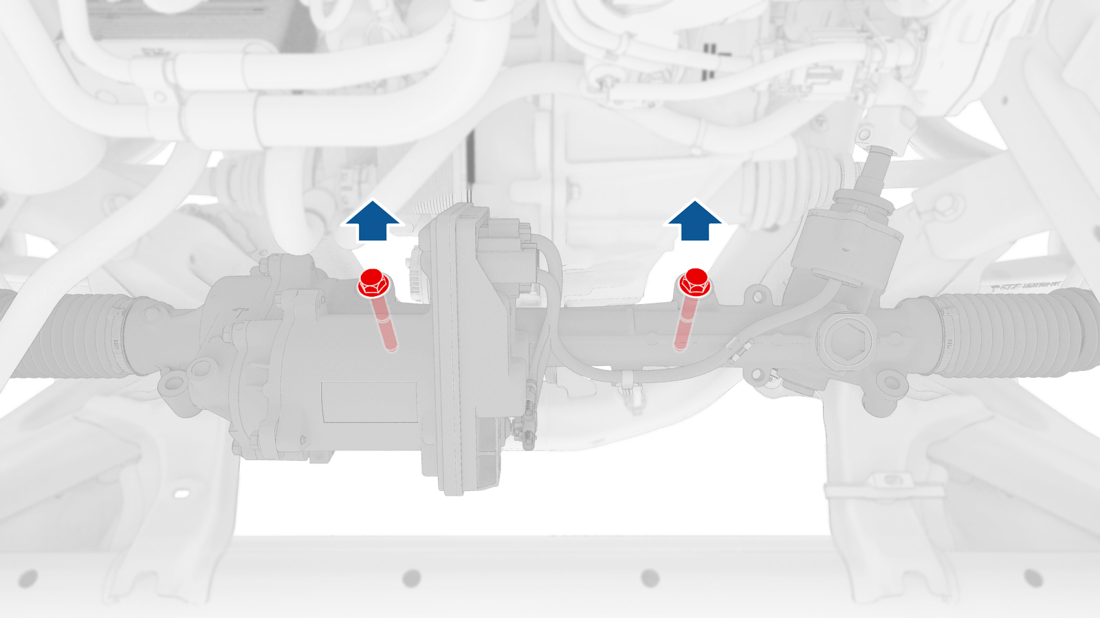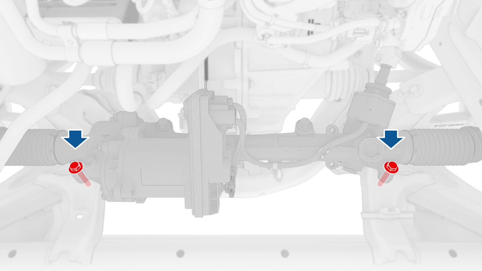 Inner bolts (x2) that attach the steering gear assembly to the front subframe |