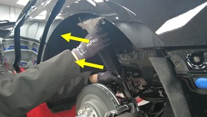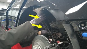 attach the LH rear damper to the body at the top mount.41 Nm (30.2 lbs-ft)NoteApply pressure at top of the damper to push down and clear LH rear wheel arch liner.NoteUse of the following tool(s) is recommended: