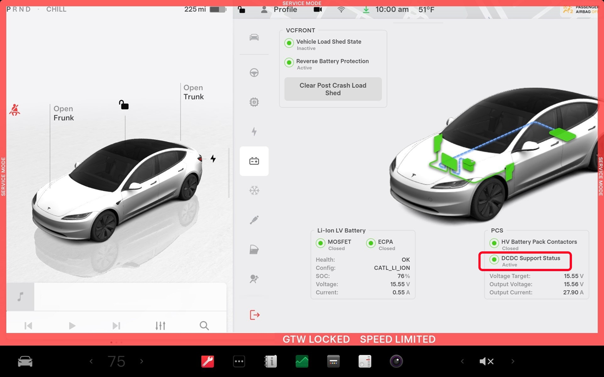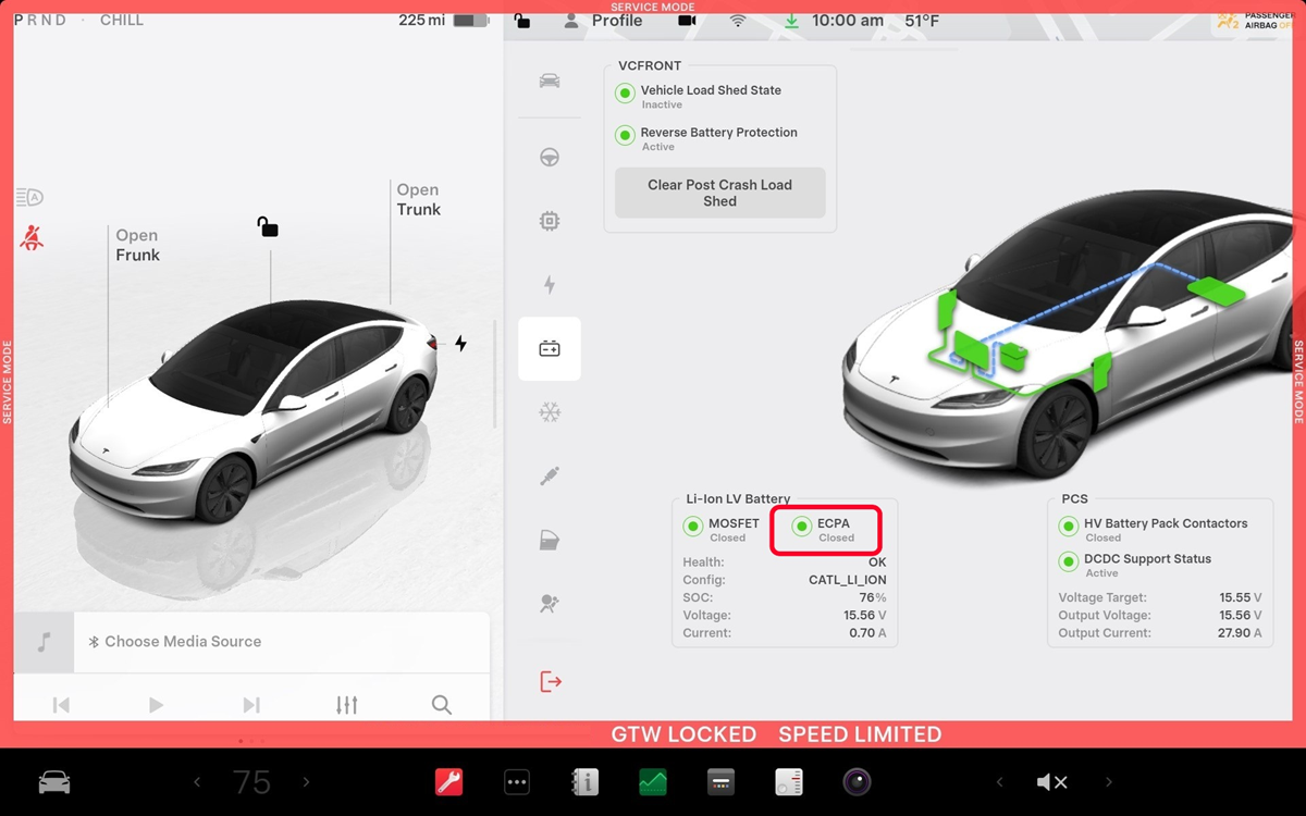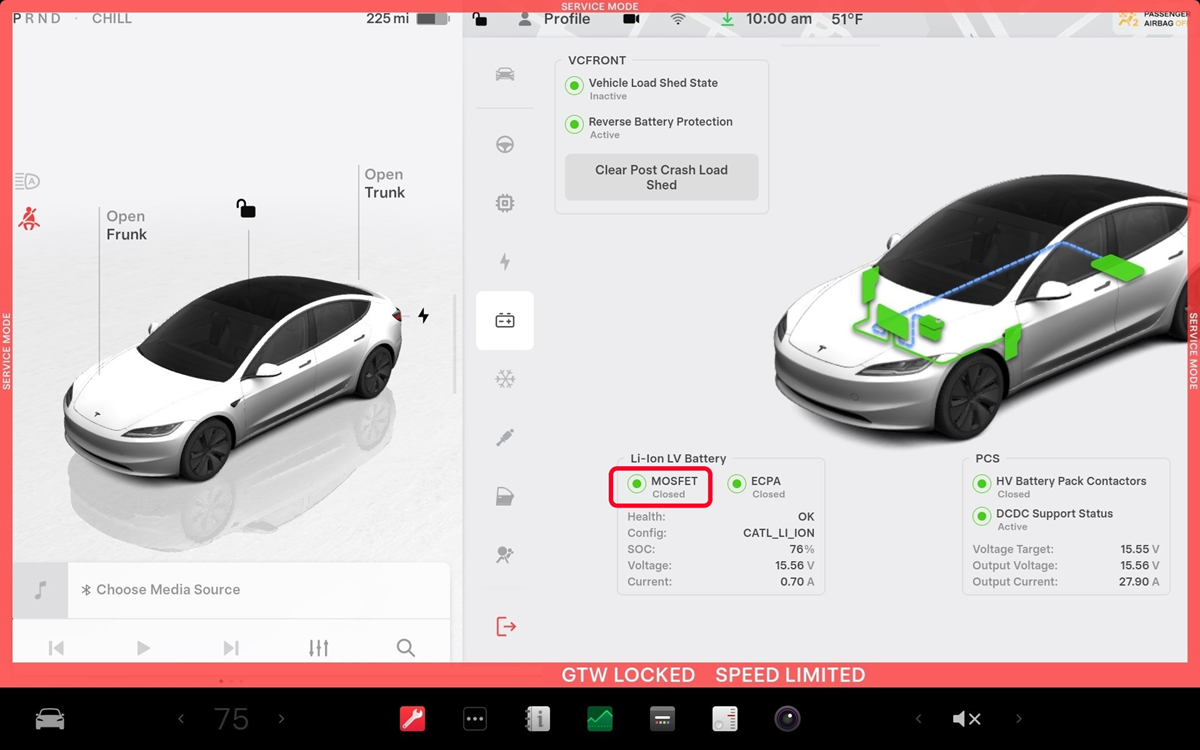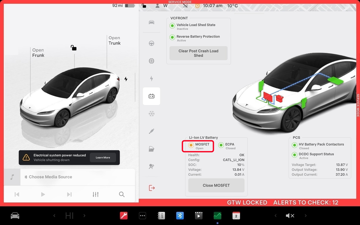 Figure 2. Li-ion LV Battery MOSFET status Open - If the previous step does not successfully recover the battery, proceed with using the Tesla LV Li-ion battery charger to recover the LV battery, and then repeat this procedure.