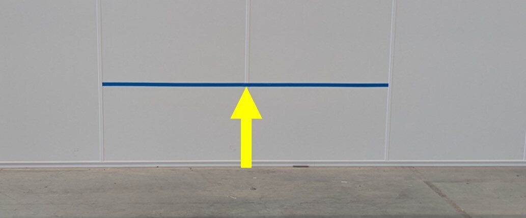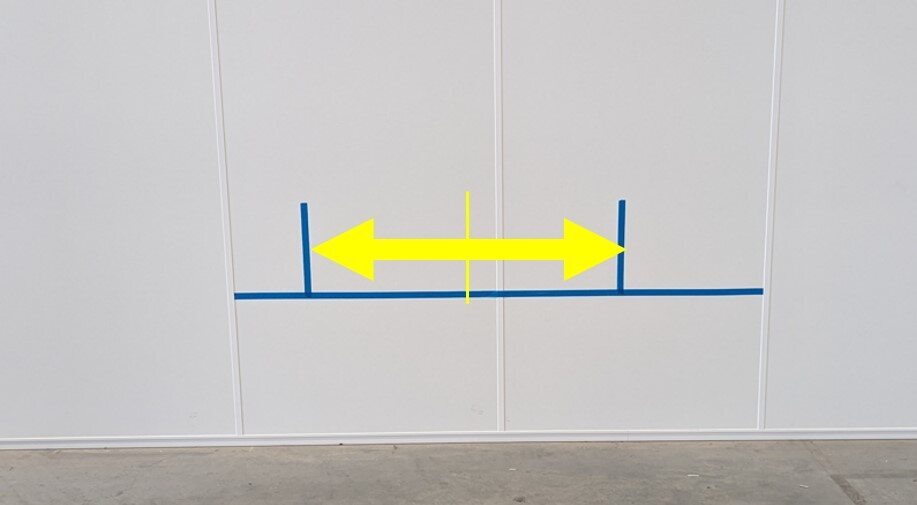 the horizontal beam aligns with the horizontal tape mark on the wall, and the left edge
