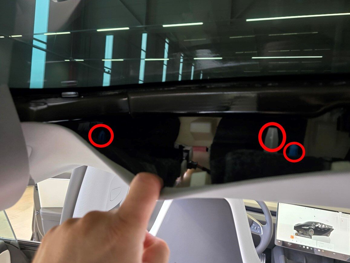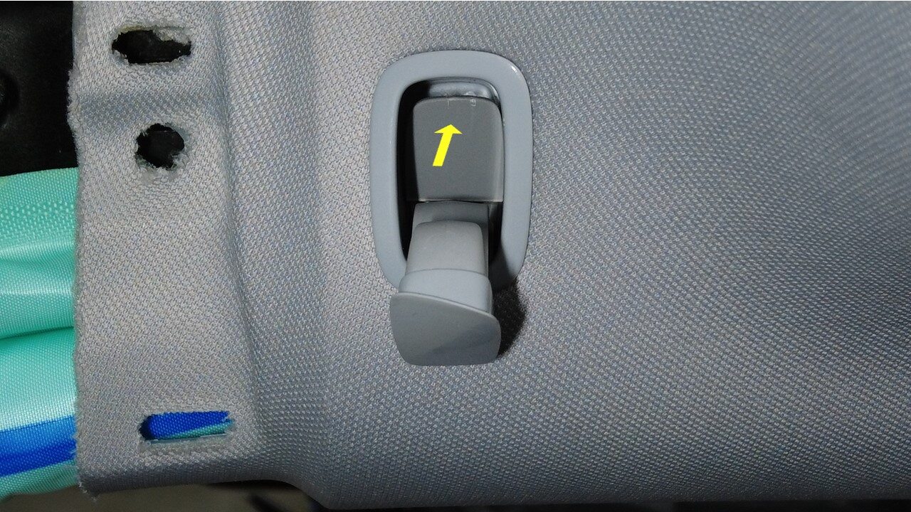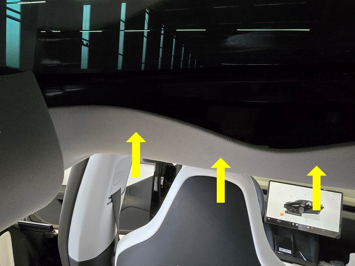 Note2x clips, 1x locating pin. First push the locating pin in the hole and then push the headliner until the clips engage.