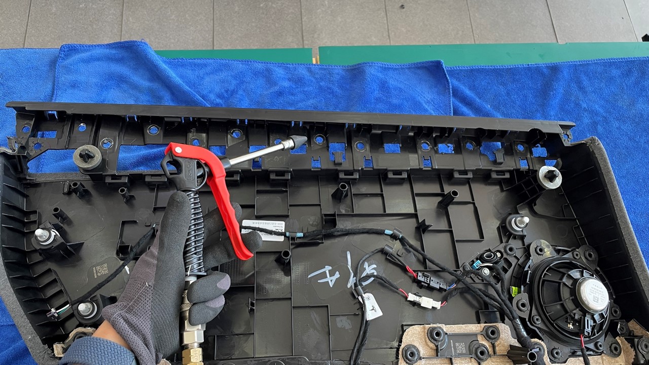 NoteThe solder joint tools are available in 2 types: round and square. Use the correct solder joint tools for welding.NoteEnsure there is no large gap between the ambient light and door trim plate, and then push down slowly to make sure the weld spot is flat.