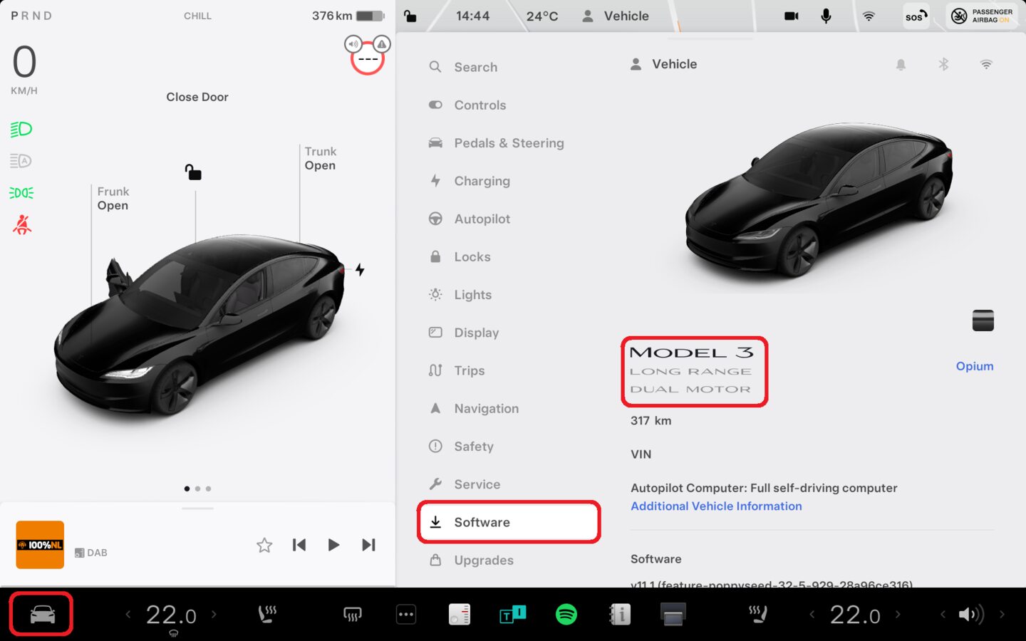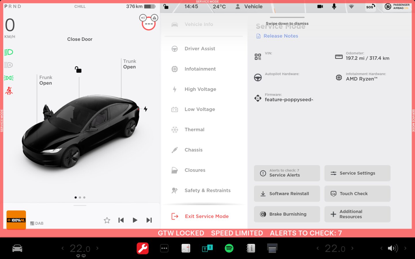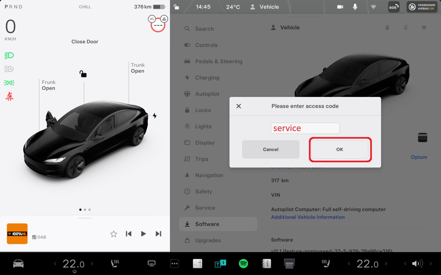 NoteVia UI > Controls > Software, Touch and hold "Model 3" for 4 seconds then release, Use screen keyboard to type "service" into dialog box then select OK