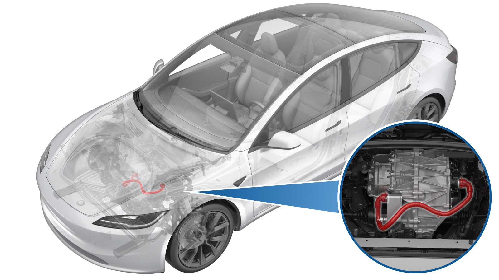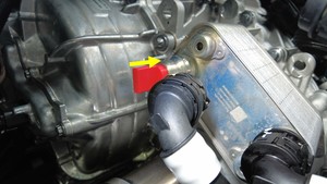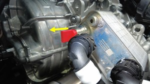 Install the inverter to oil cooler hose to the front drive unit by securing the