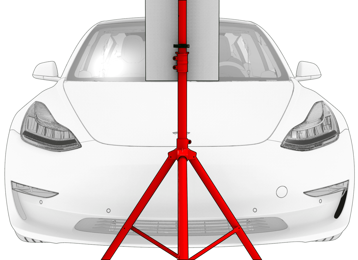 CAUTIONDo not use existing marks from previous verifications. Remove any existing tape. Measure and reapply new tape to ensure the tape is in the correct location.NoteThe checker pattern on the target is used for vehicles with 1st generation Autopilot. Ignore the checker pattern when affixing the tape.NoteIf the vehicle is equipped with aftermarket suspension components that alter the vehicle ride height, the red tape might have to be adjusted to ensure accurate pitch verification.
