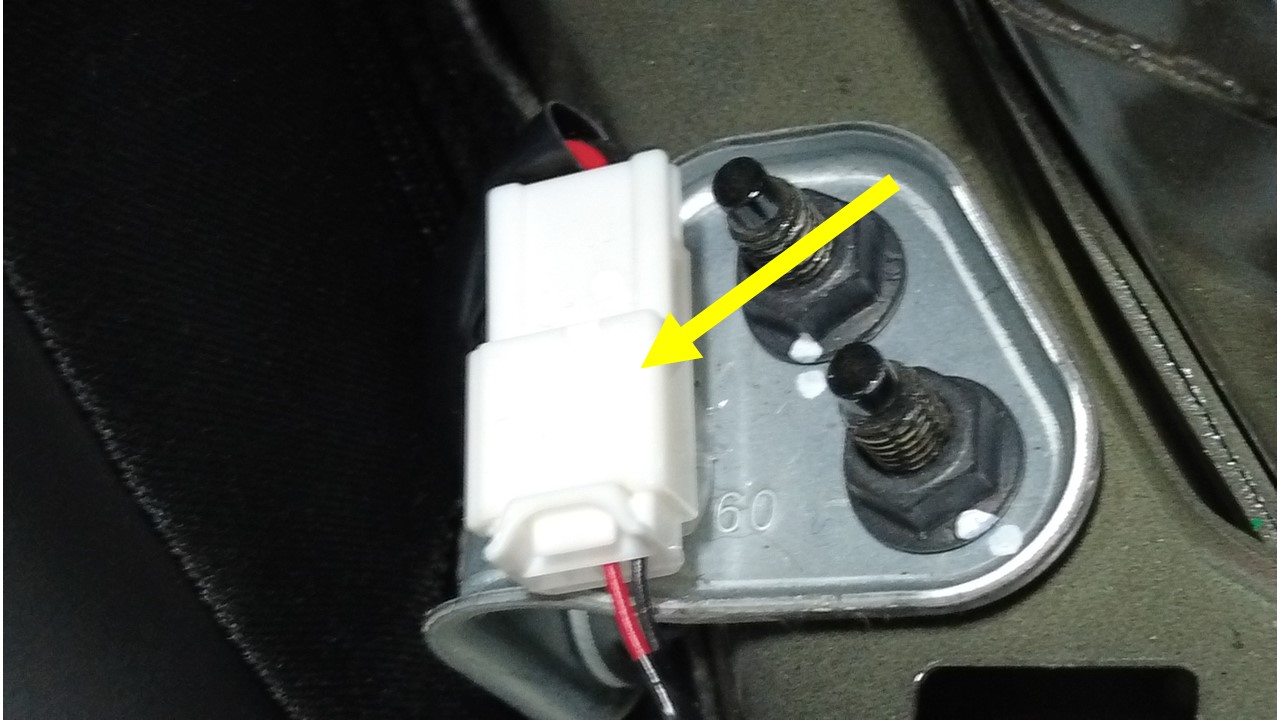 Disconnect clip securing LH rear seatbelt buckle harness to vehicle