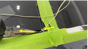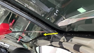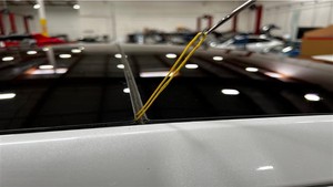Secure the line to the starter tool and push the tool through the urethane at the LH rear corner of the fixed roof glass assembly.