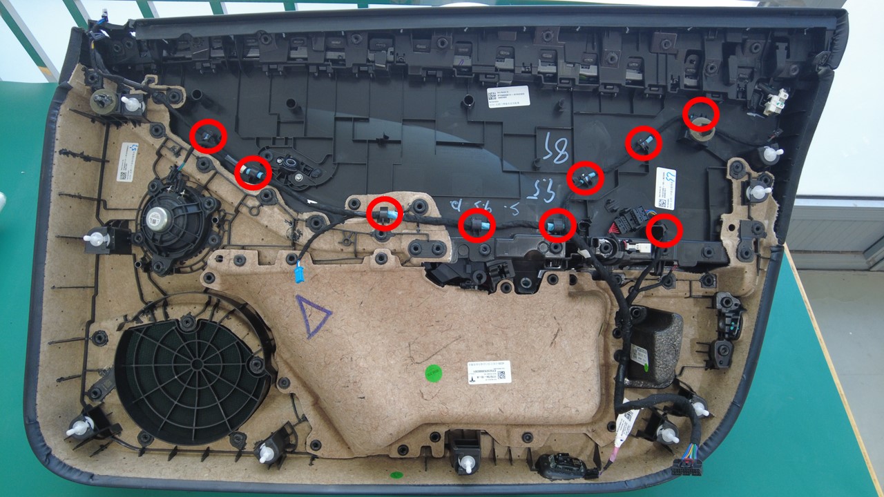 Install the door harness into the door panel. Secure it into the hooks (x9) and fir