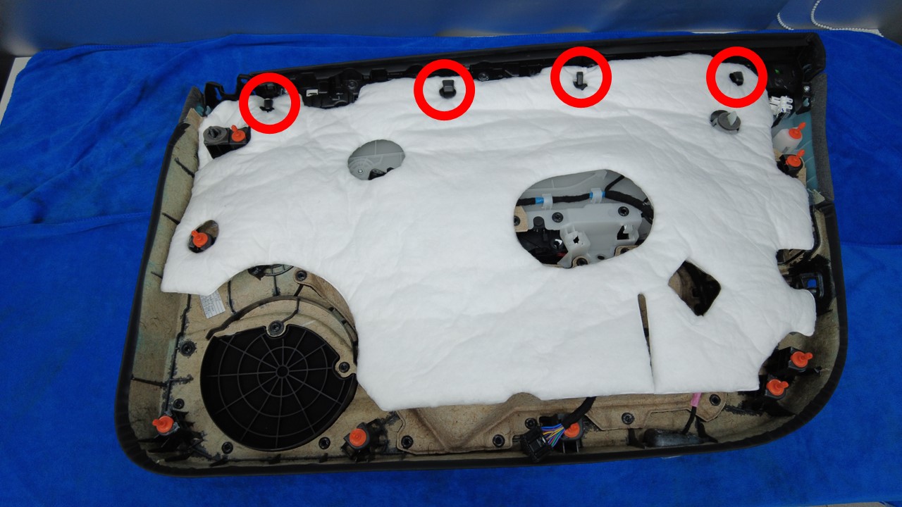 Install the NVH pad into the door panel, then secure the tabs (x4).