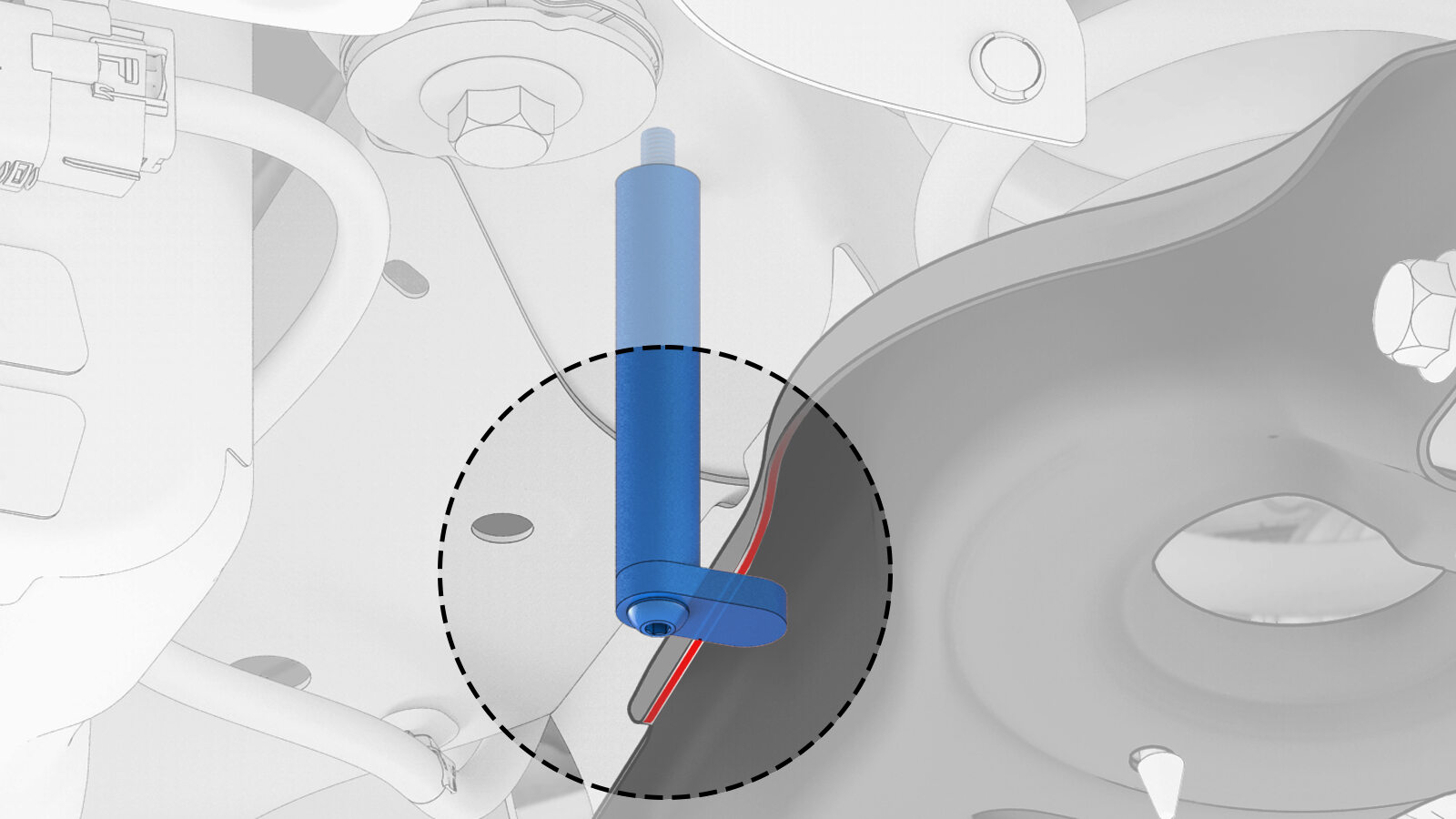 tool rests against the bottom edge of the lower aft link, as