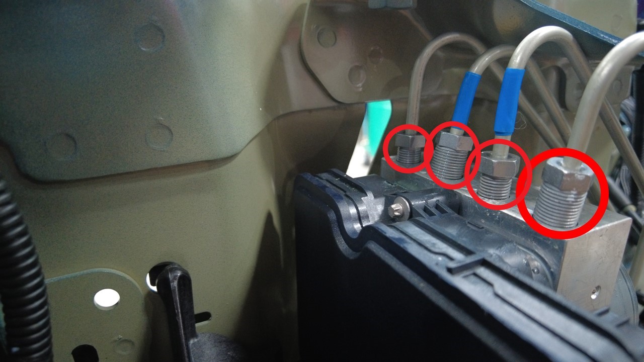 Nuts that attach the brake lines to the hydraulic control unit |