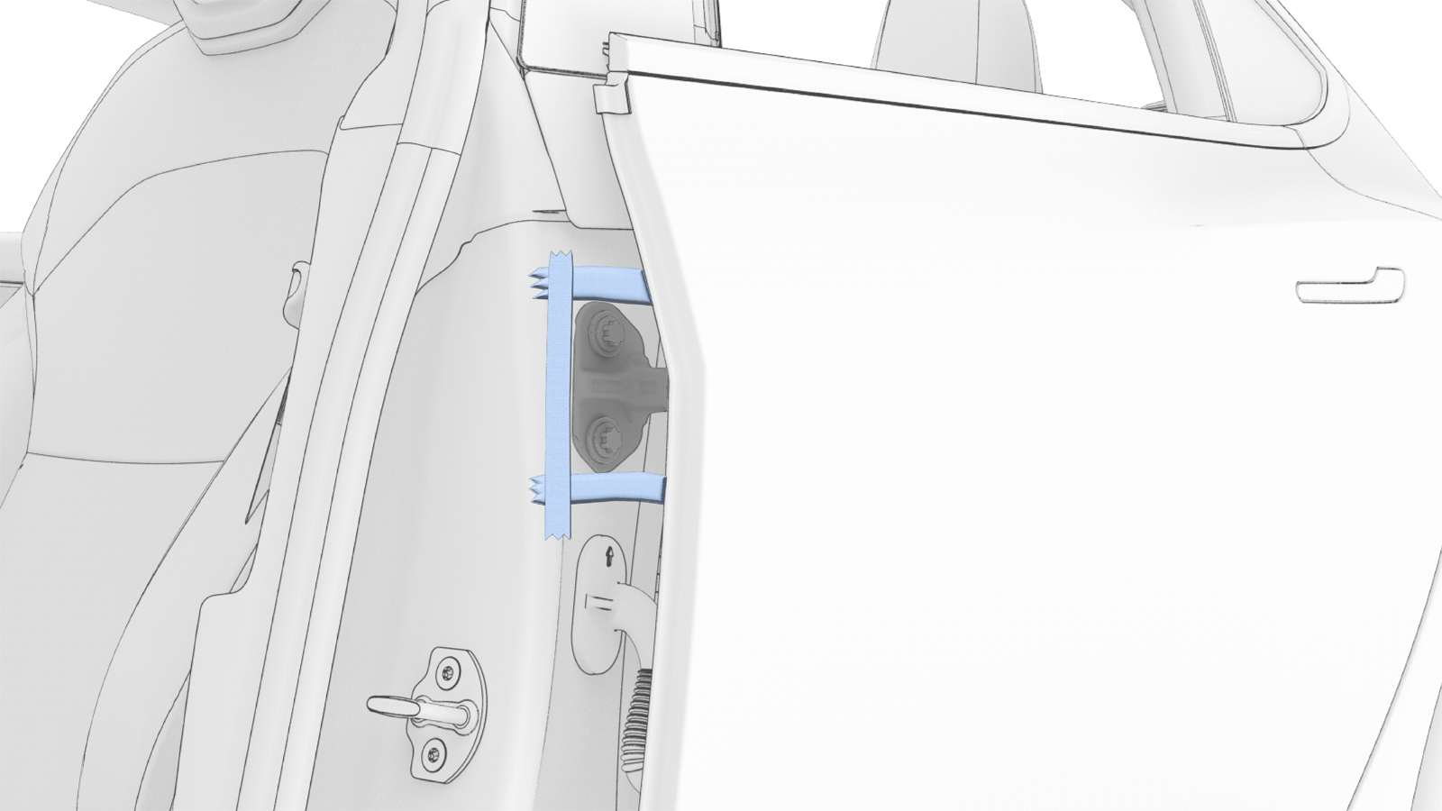 surrounding the LH rear door upper hinge on the body and door to aid in alignment during
