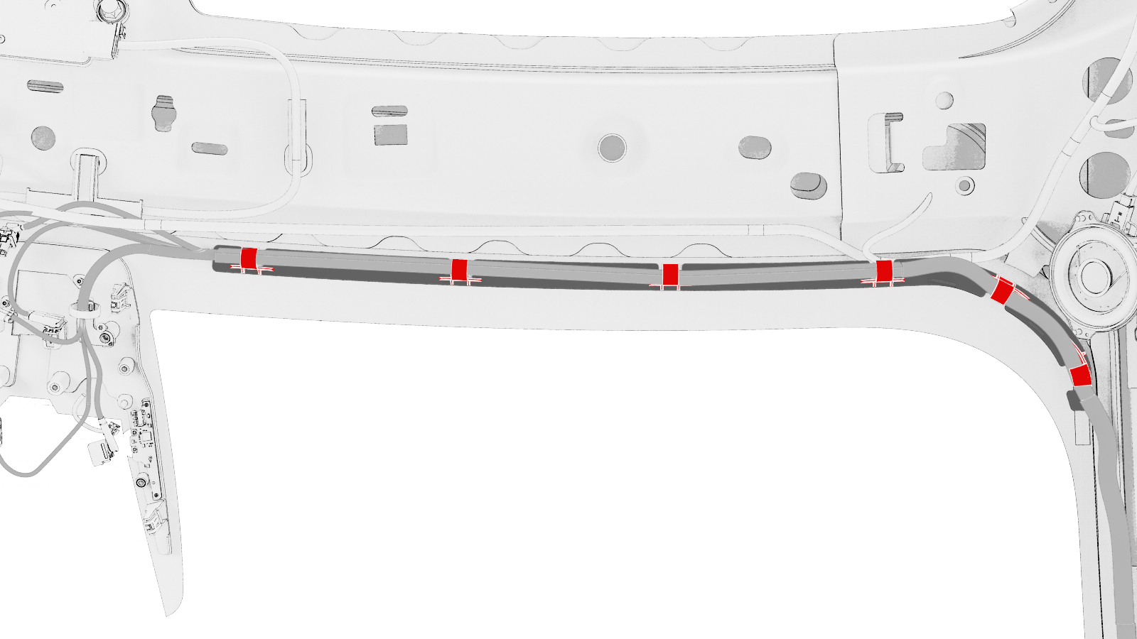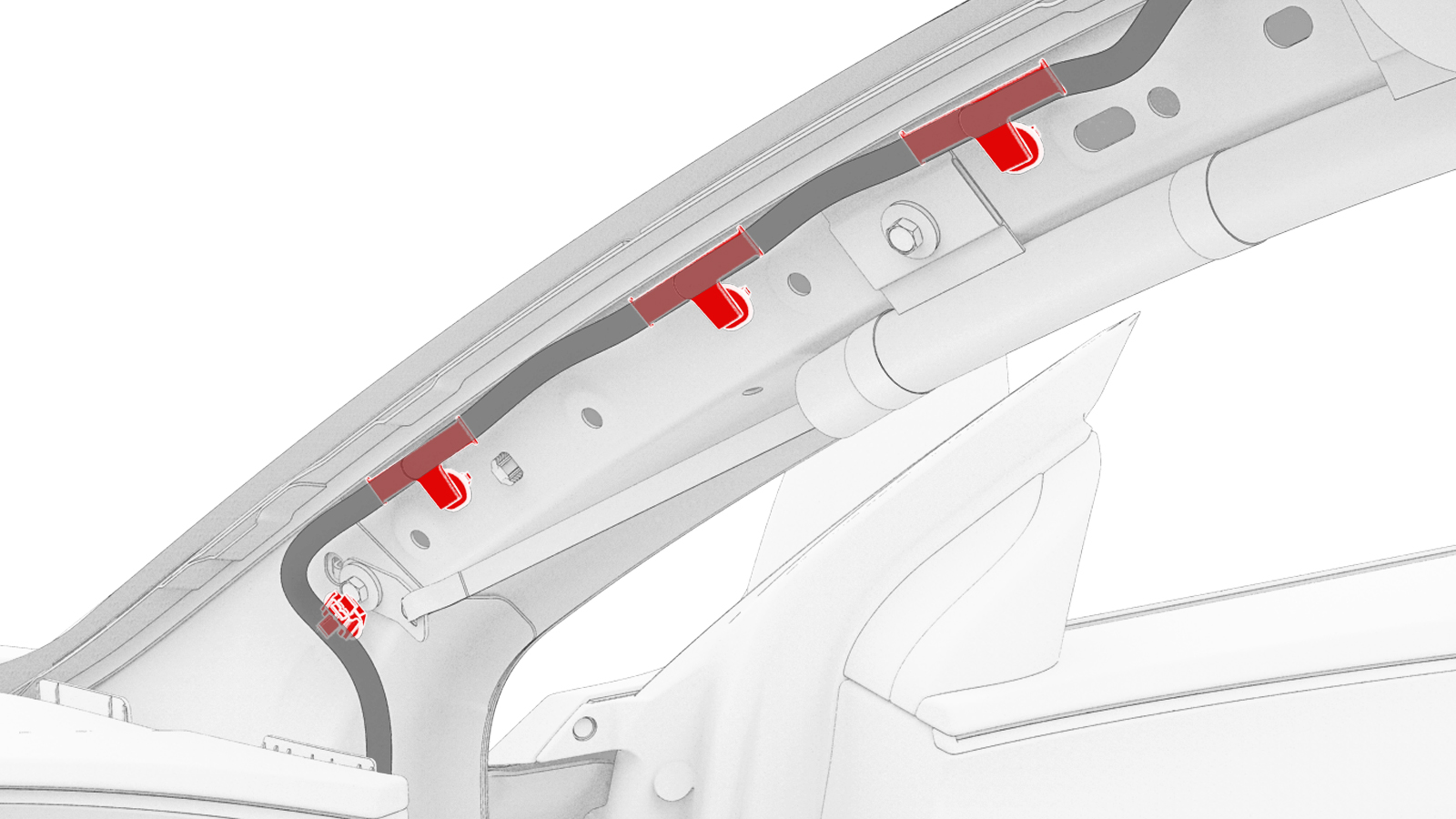 Fasten the clips (x6) that attach the windshield harness to the windshield fastener track bracket.