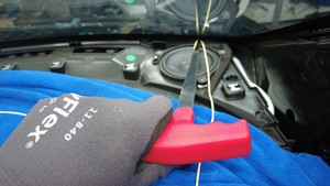 Secure the wire to the starter tool and push the tool through the urethane at the RH lower side of the windshield assembly.