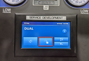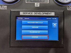 NoteEnter refrigerant account noted in the A/C recovery.NoteThe A/C machine chimes when recharge is complete.