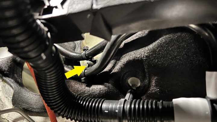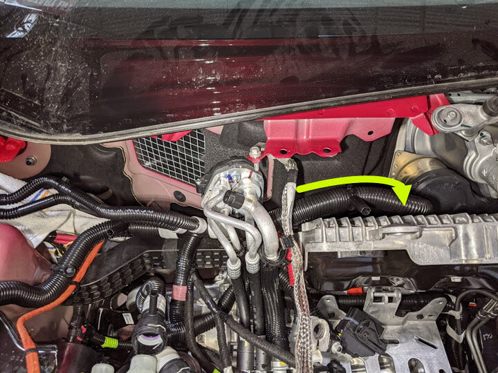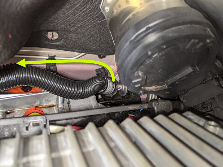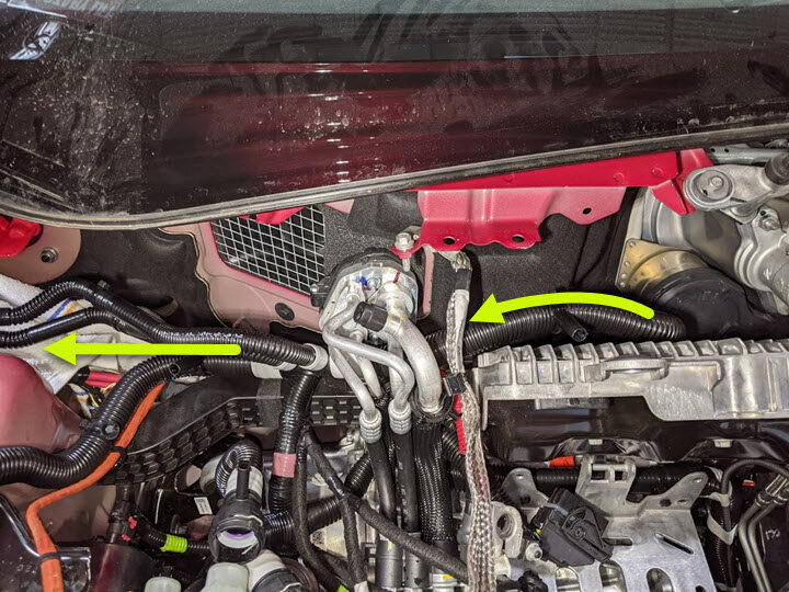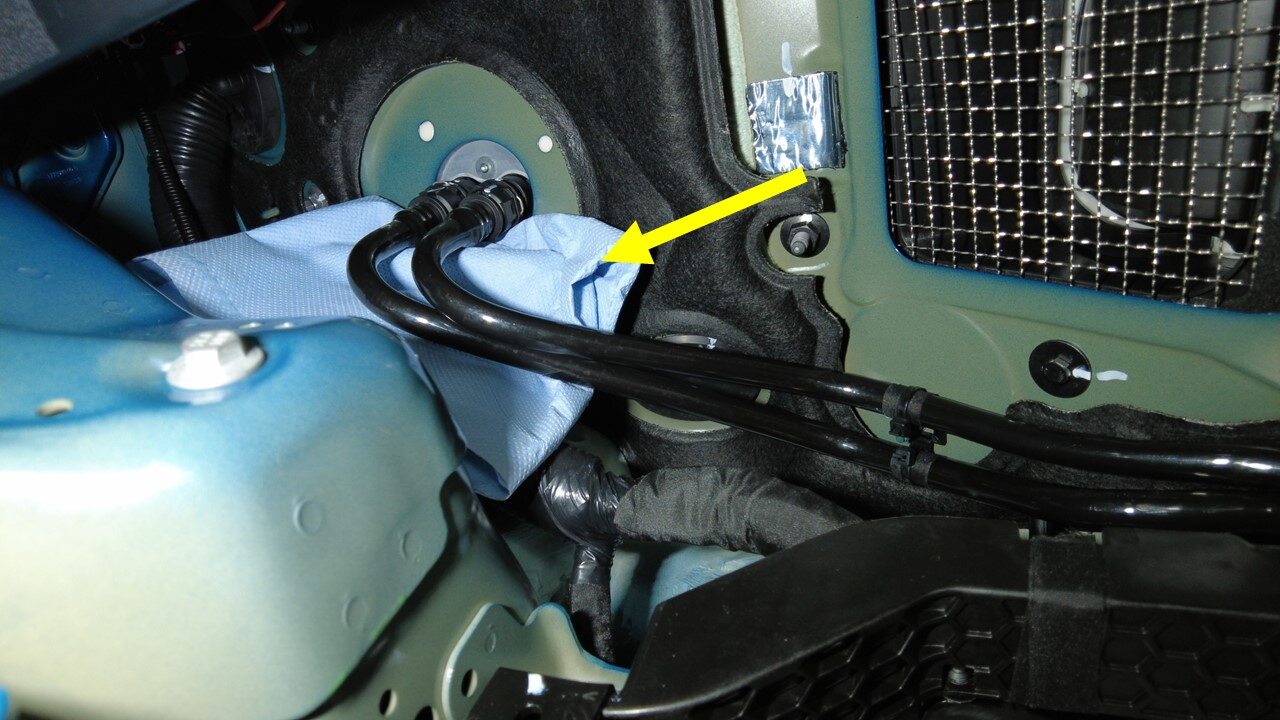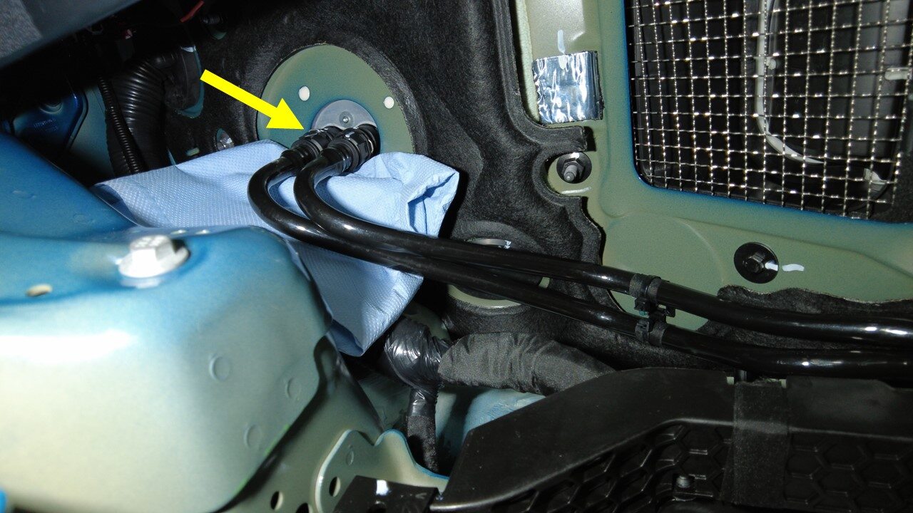 NoteFeed hose into position from RH side of vehicle along bulkhead, Gently maneuver hose as needed to clear surrounding objects, See images for clarity.