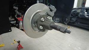 - Remove the lug nuts (x5) and the puller washers (x5) from the LH rear rotor studs, and then remove the hub puller from the rotor.