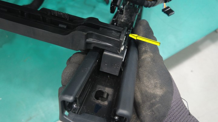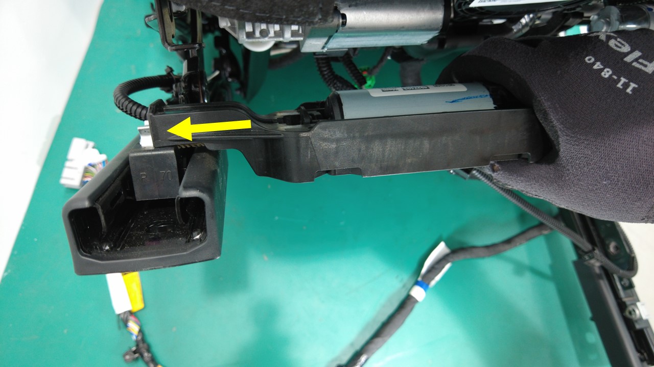 With assistance, remove the harness clips (x3) from the seat track motor bridge