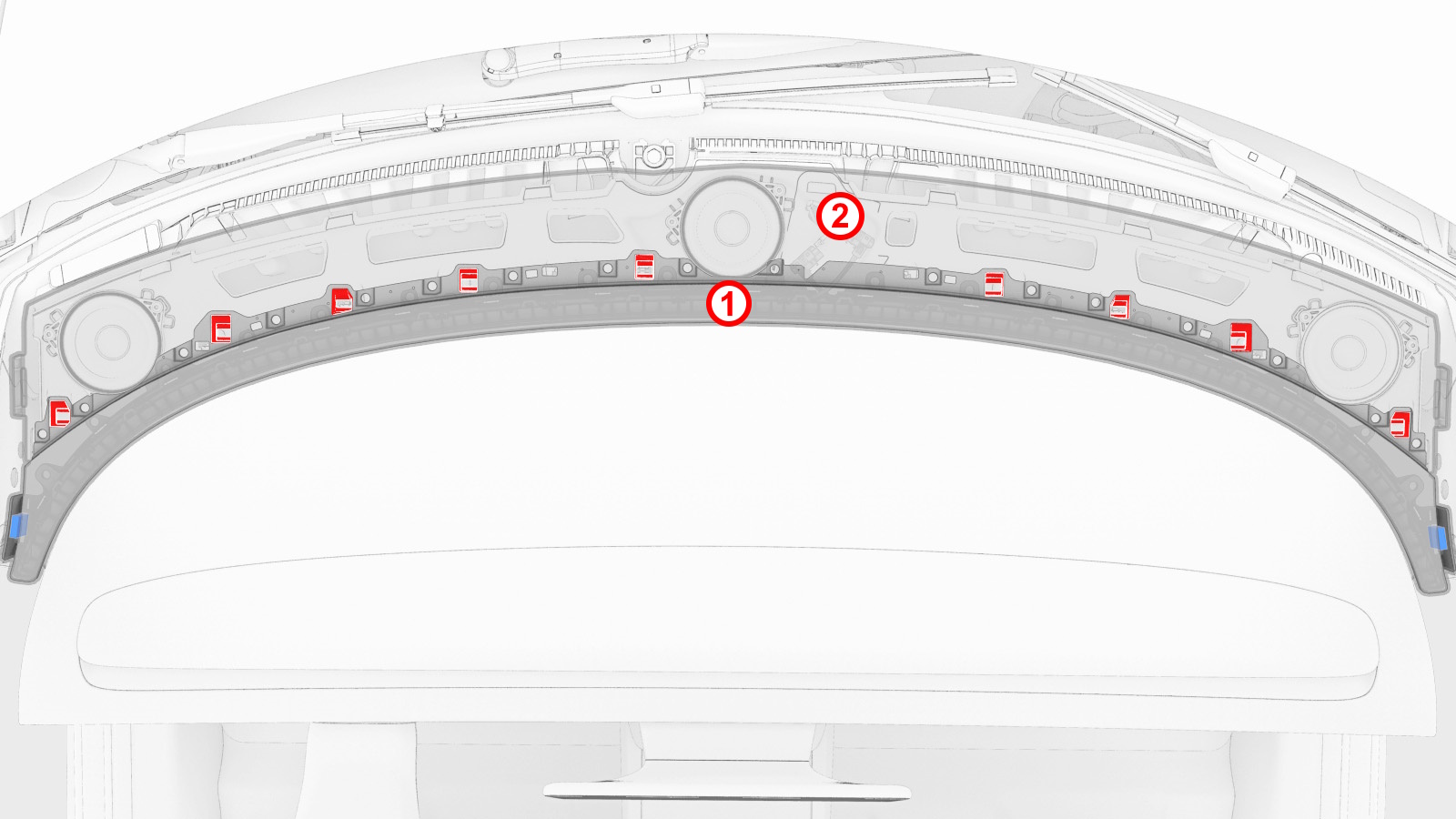 CAUTIONDo not lift on the speaker grille (refer to image, callout 2) in attempts to release the clips and guide tabs. Lift on the upper instrument panel trim (refer to image, callout 1) and the grille and trim will release as one assembly.CAUTIONDo not pull the grille too far away from the instrument panel, as the grille electrical connectors are still attached.