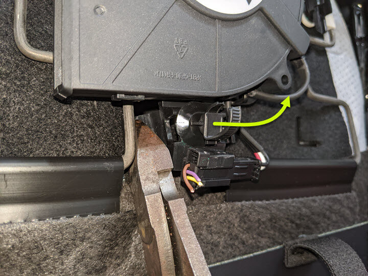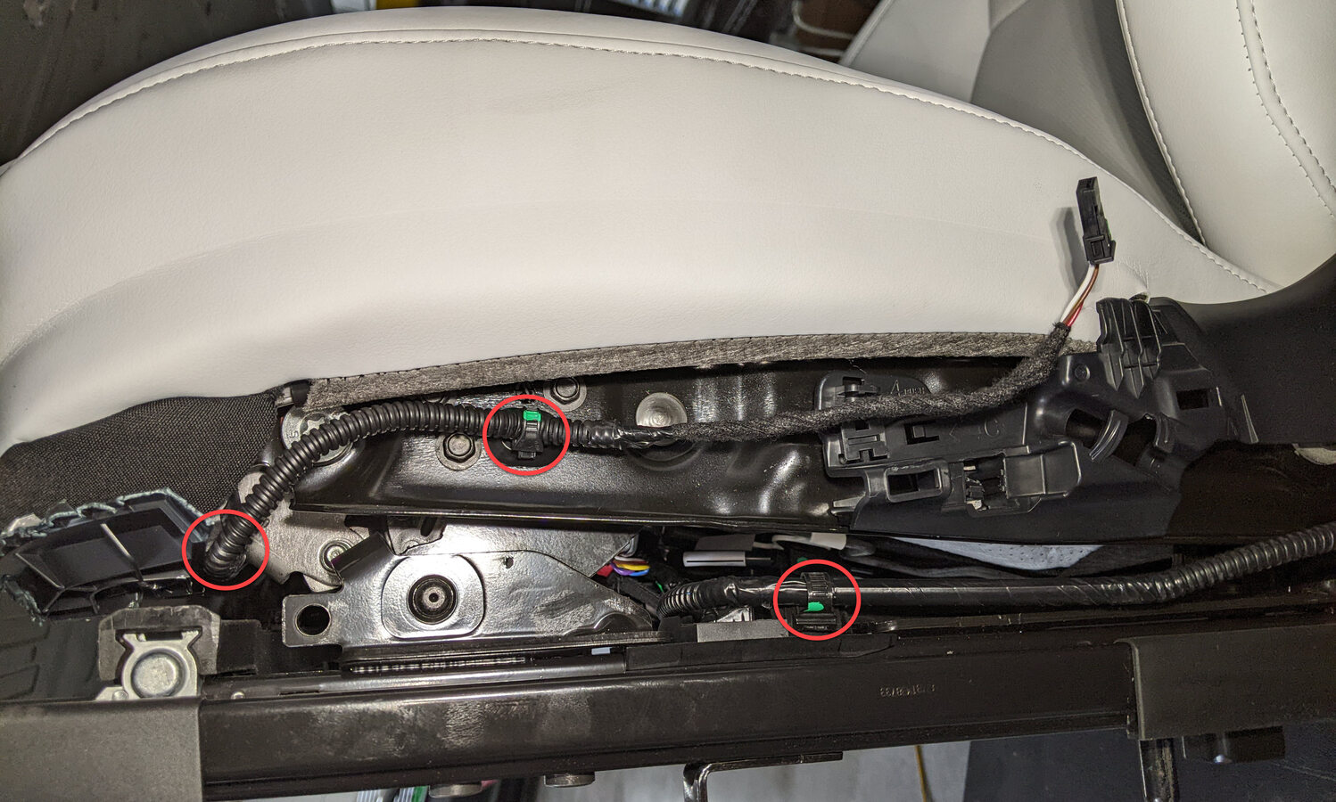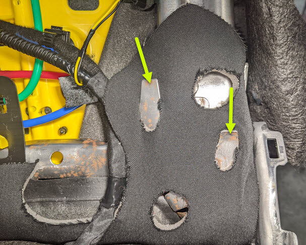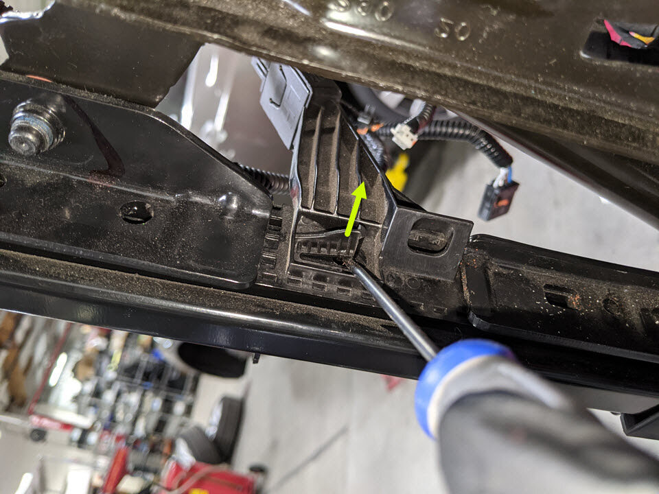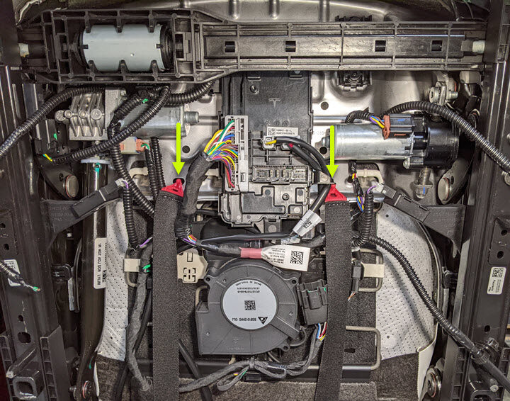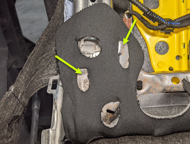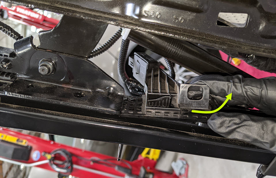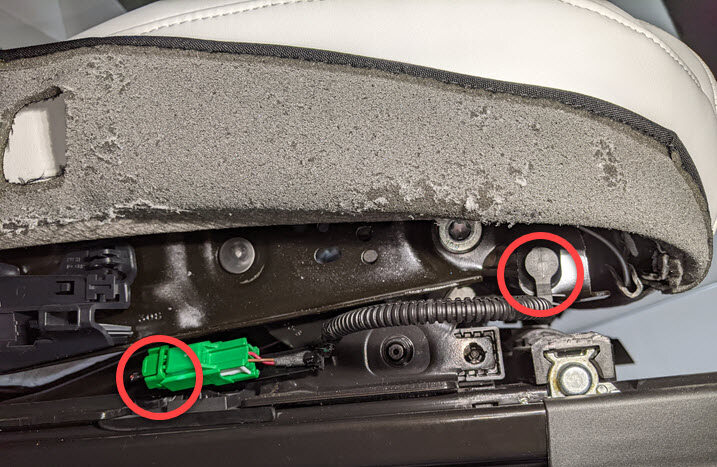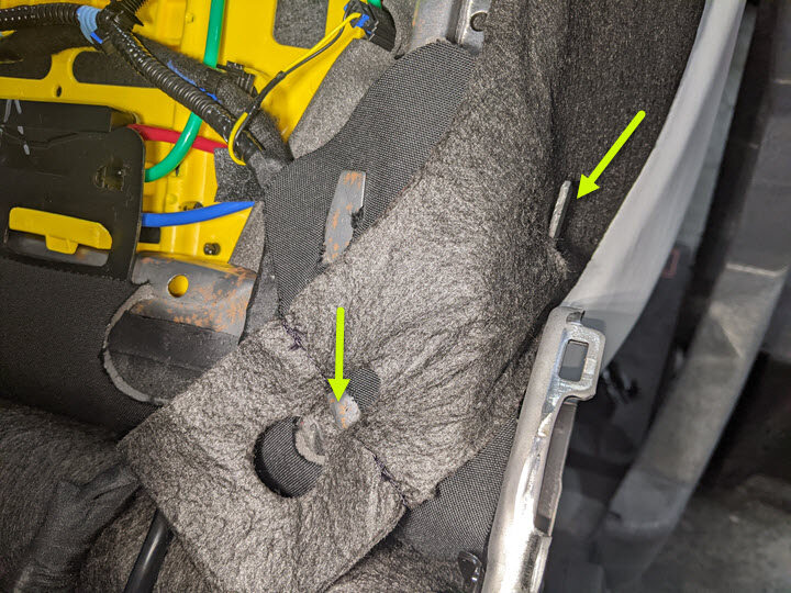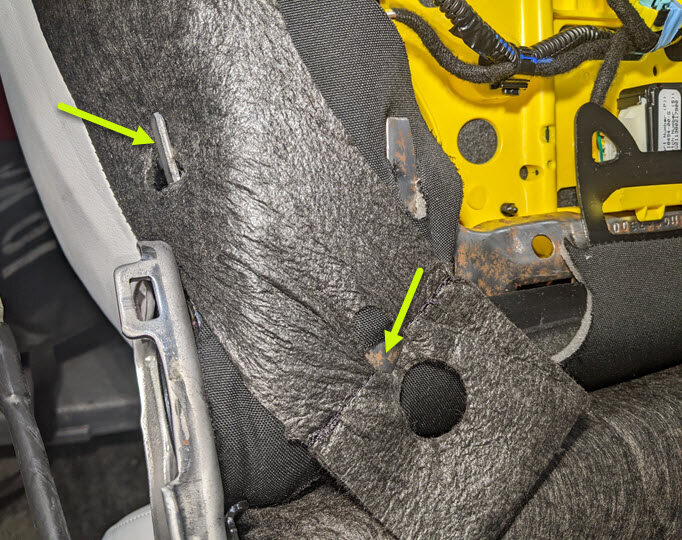 Cut LH front seat harness clips from RH side of seat cushion frame