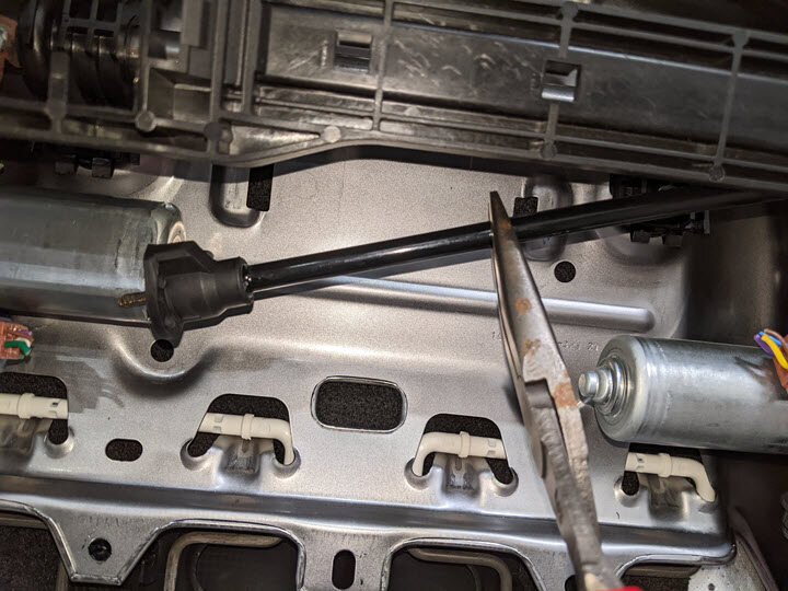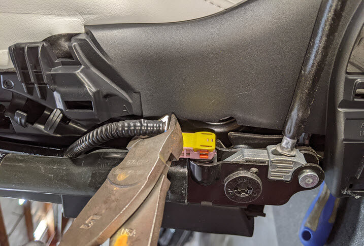Cut LH front seat harness from seat cushion frame
