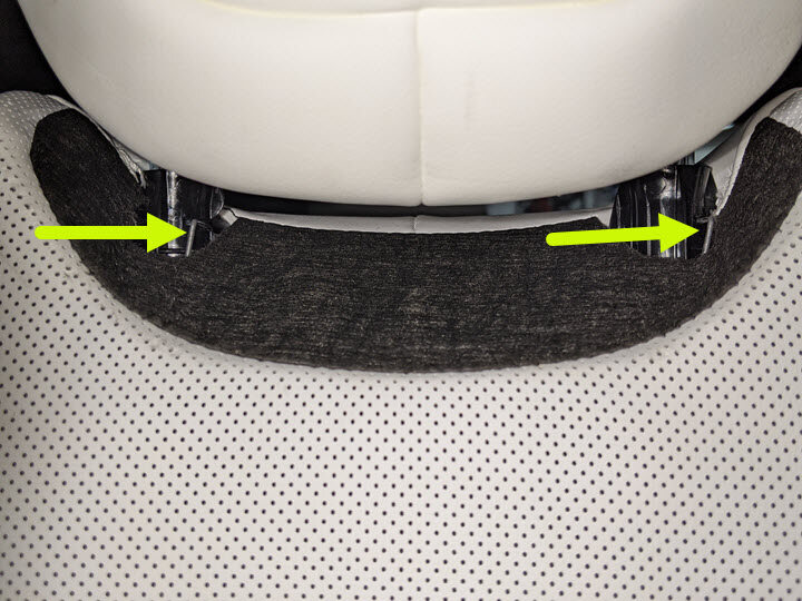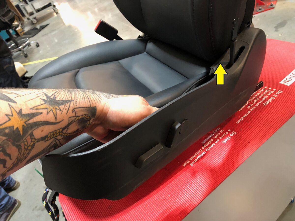 Note2x clips, 2x tabs, Release leading edge of trim and slide away from seat frame