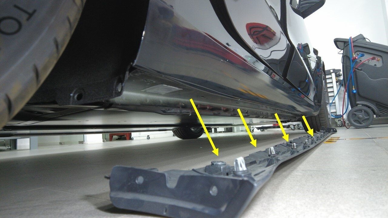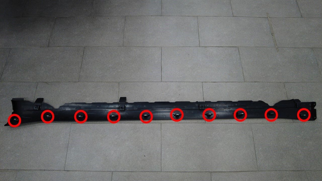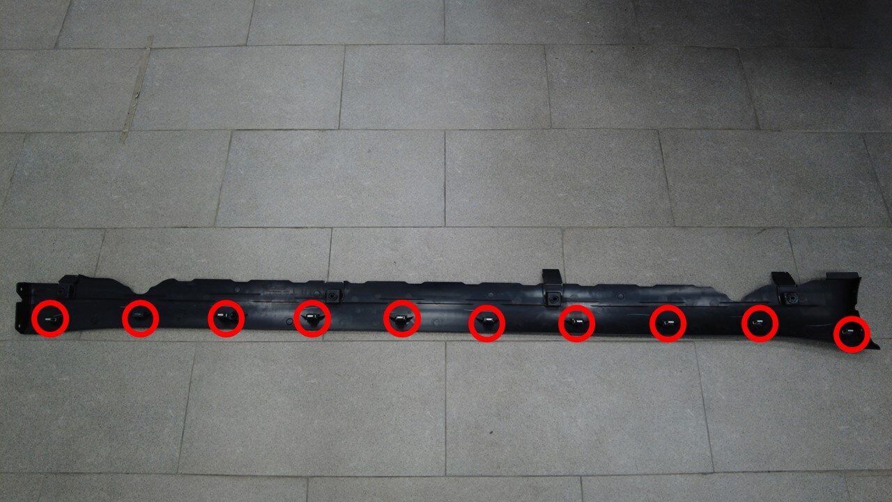 Note11x clips, 2x positioning clips, 1x tab, Use trim tool starting at rear edge to release upper clips, If the clip is too tight, Use prytool to remove the clips, Then pull bottom to release remaining clips, Finally, release the tab and pull out the side panel backward, Replace the clips if it is damaged.