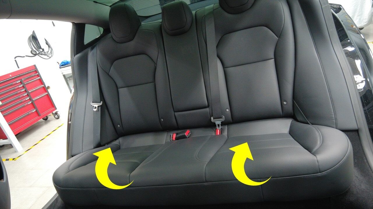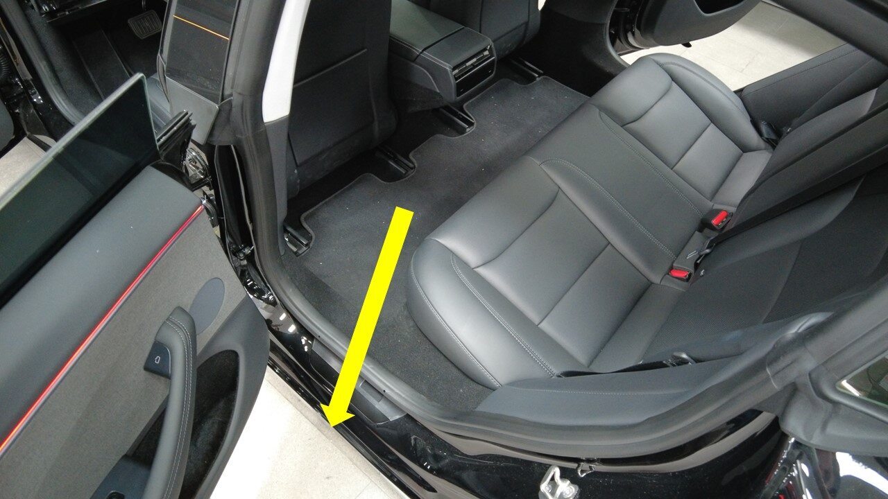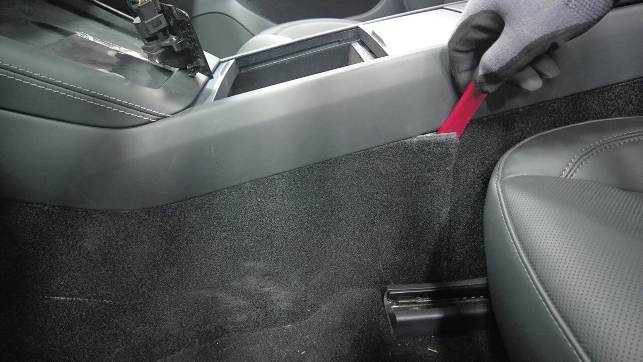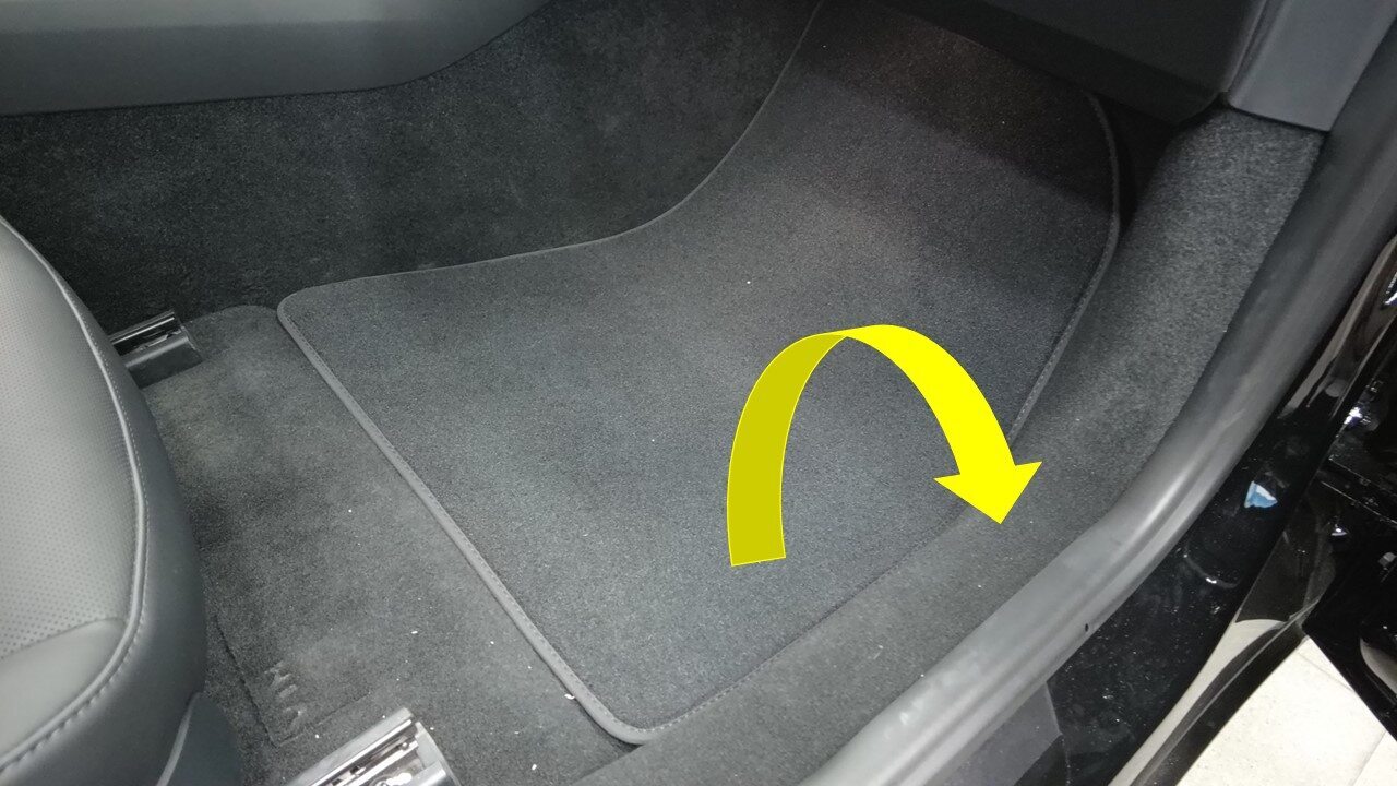 Note2x clips, Lift center piece and pull carpet back, Release seat harness from clips to allow carpet to fold back more.